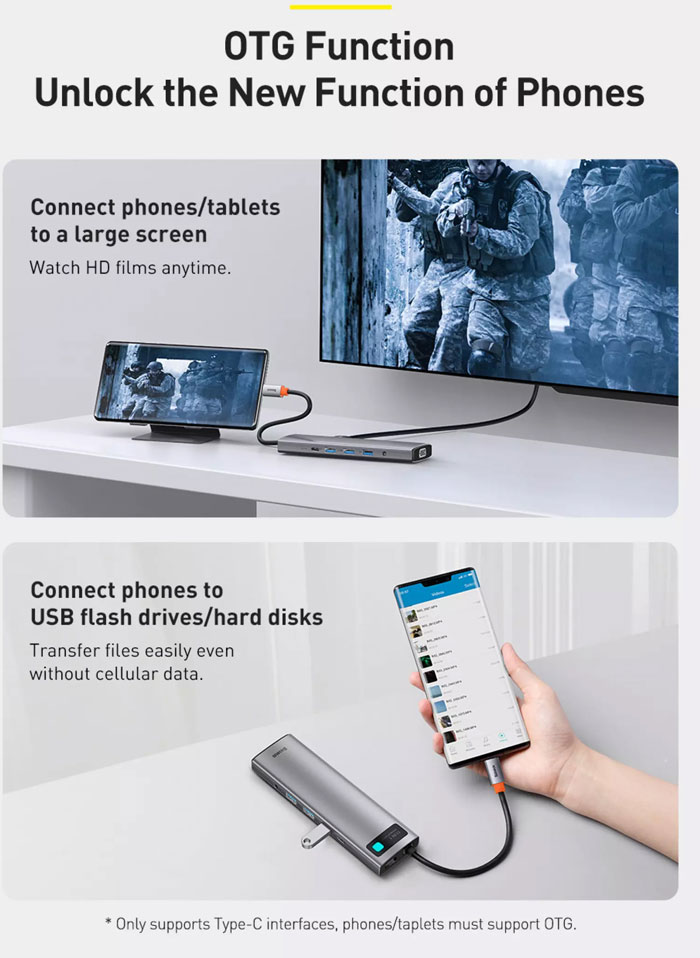 OTG: این هاب فقط برای لپ تاپ نیست و اگر گوشی یا تبلت شما از OTG پشتیبانی کند به آن هم وصل میشود. همانطور که میدانید گوشیها USB را نمیخوانند و برای اتصال باید گوشیتان از قابلیت OTG بهرهمند باشد. قابلیت OTG که برای اتصال مستقیم USB به گوشی به کار میرود هم توسط این هاب پشتیبانی میشود و شما میتوانید به راحتی کارت داخل هاب یا فلش/هارد که به پورت USB آن وصل شده را در گوشی باز کنید.
