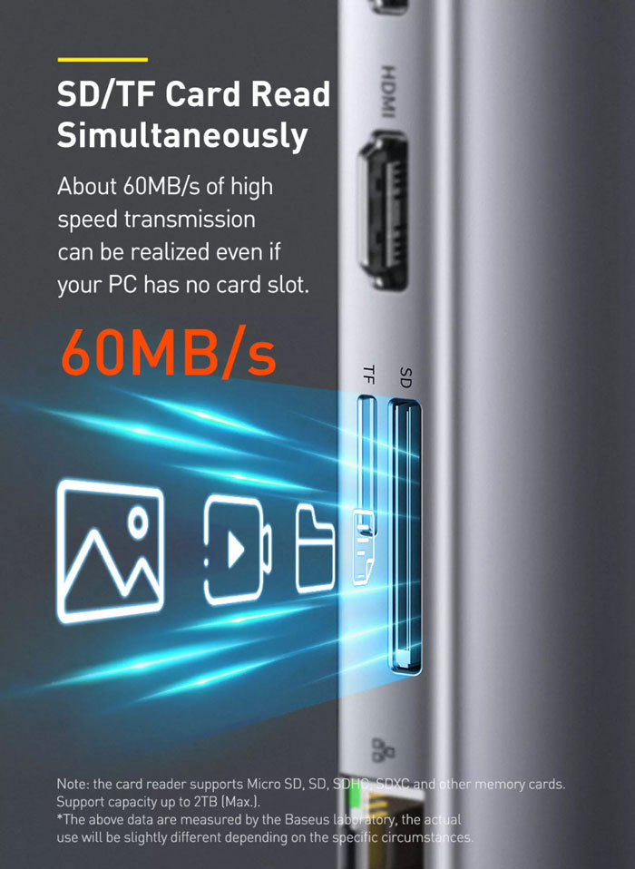 درگاه کارت حافظههای TF/SD: دو عدد درگاه کارت حافظه یکی Micro SD و دیگری SD بر روی هاب Type-C بیسوس Metal Gleam قرار گرفته است. این درگاهها میتوانند با سرعت حداکثر 60MB/s به انتقال داده بپردازند و راه حلی جایگزین برای انتقال فایل به لپ تاپ محسوب شوند.