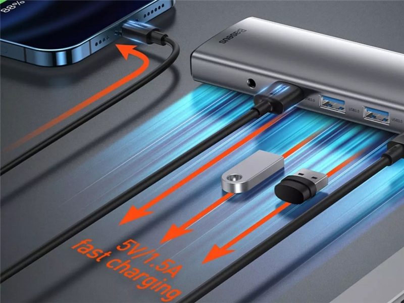 BC1.2: در نظر داشته باشید که این هاب از پروتکل BC1.2 نیز پشتیبانی میکند. فقط کافیست پورت تایپ سی را به آداپتور برق بزنید و به کمک کانکتور تایپ سی و یکی از پورت های USB ، گوشی تان را شارژٰ کنید. به ترتیب میتوانید همزمان دو گوشی را با سرعت بالا، توسط این هاب شارژ نموده و در وقت و زمان خود صرفهجویی کنید. شایان ذکر است که دستگاه شما نیز باید از این سرعت بالا پشتیبانی کند.