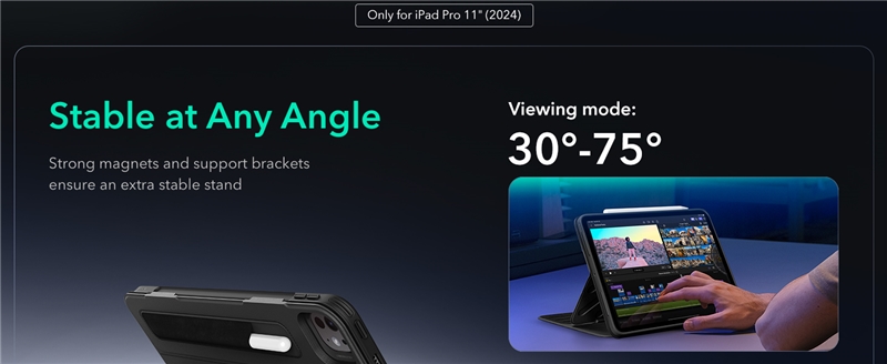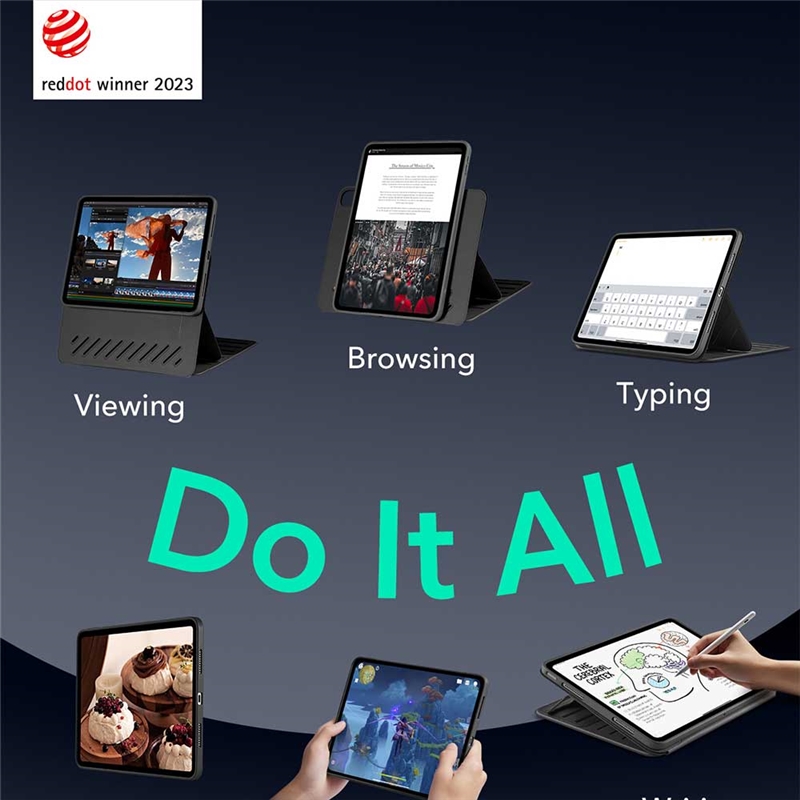 این کاور با استفاده از دو پایه پشتیبانی و ۶ شیار مغناطیسی، امکان تنظیم آیپد در ۹ زاویه مختلف را فراهم می‌کند. از این ۹ زاویه، ۶ زاویه برای تماشا و ۳ زاویه برای نوشتن در نظر گرفته شده‌اند. همچنین می‌توانید این کاور را به‌سرعت جدا کرده و برای بازی‌های دستی یا اتصال مغناطیسی به یخچال استفاده کنید.
