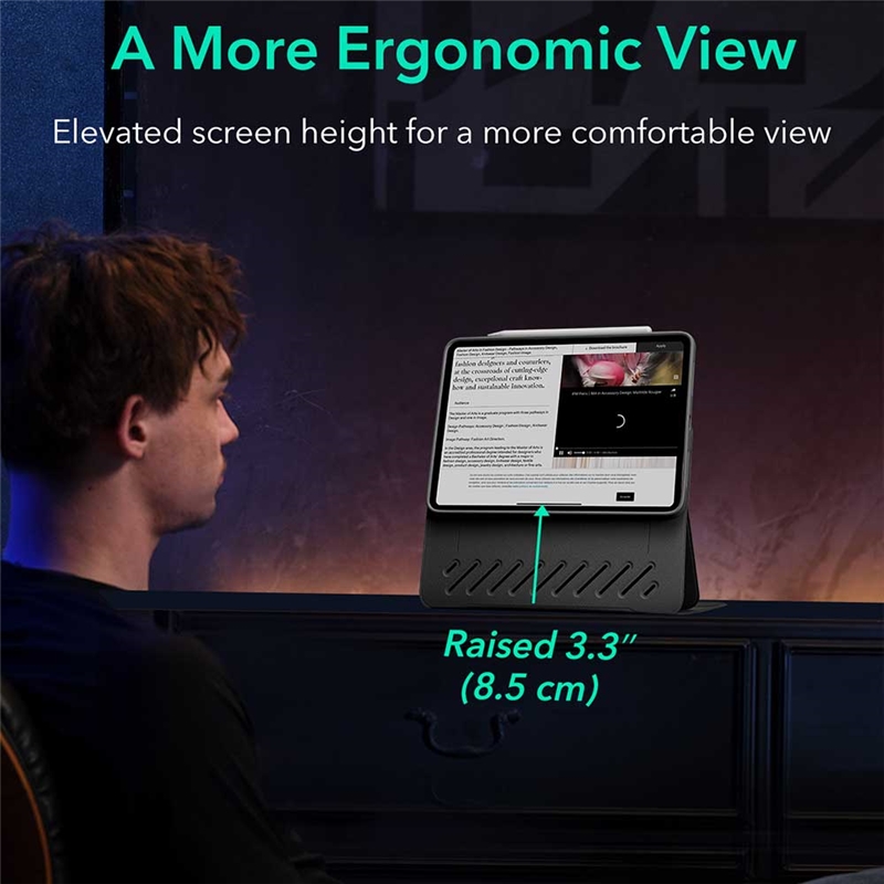 با استفاده از این کاور، آیپد ایر خود را در ارتفاعی نزدیک‌تر به خط دید طبیعی خود قرار دهید و در طول مدت زمان طولانی استفاده، در موقعیتی راحت‌تر و نشسته باشید. این ویژگی به‌ویژه برای کاربرانی که ساعات زیادی را به استفاده از آیپد می‌گذرانند، بسیار مفید است.