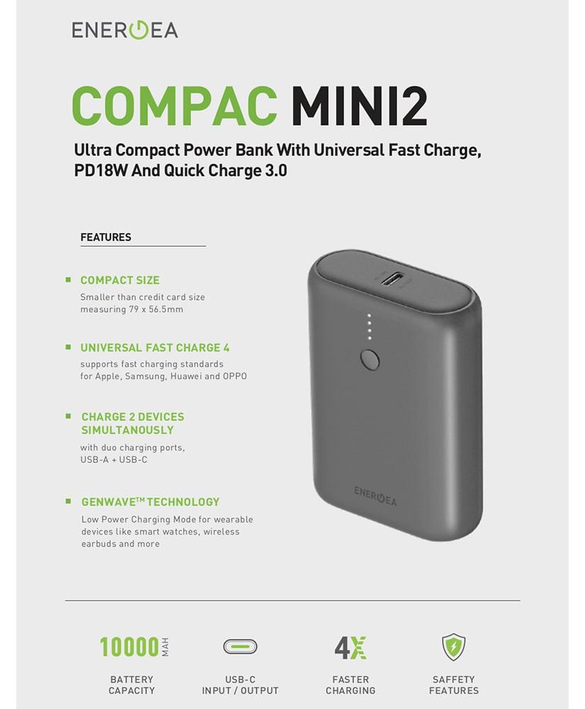 کمپانی انرژیا پس از عرضه موفق سری اول پاوربانک های Compac Mini، سری دوم این محصول را با نام تجاری “Compac Mini 2” طراحی و عرضه نموده است که ویژگی های بیشتری را داراست. پاوربانک Compac Mini 2 انرژیا با ظرفیت 10000 میلی آمپر ساعت دارای یک پورت ورودی/خروجی USB-C و یک پورت خروجی USB-A می باشد.