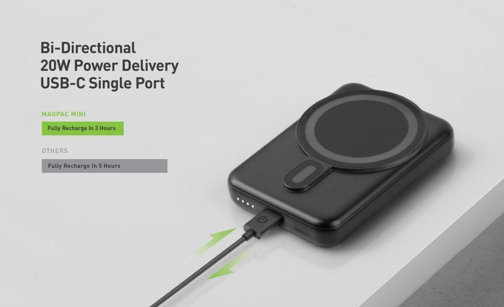 پاوربانک MagPac Mini از تکتولوژی شارژ سریع Power Delivery با توان 20 وات پشتیبانی می کند. این فناوری موجب می شود تا شارژ گوشی به کمک پورت USB-C بسیار سریع تر باشد. همچنین شارژ باتری داخلی پاوربانک نیز نسبت به پاوربانک های معمولی بسیار سریع تر است. باتری داخلی MagPac Mini در مدت زمان 3 ساعت فول شارژ خواهد شد.