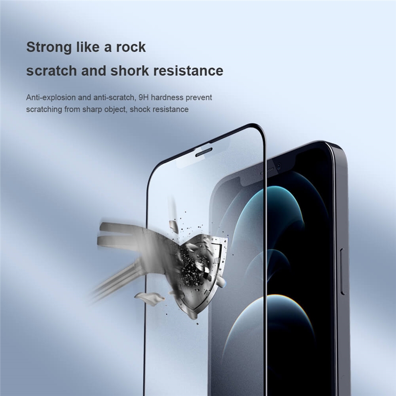 گلس نیلکین Apple iPhone 12 Pro Max از پوشش 9H بهره برده است که به خوبی از صفحه نمایش در برابر خط و خش افتادن و خرد شدن جلوگیری می کند و به همین دلیل می توانید با خیالی راحت تلفن همراه را در جیب شلوار، کیف و... قرار دهید و نگران خراشیده شدن صفحه نمایش گوشی به وسیله دسته کلید و وسایل تیزی از این قبیل بر روی آن نباشید.