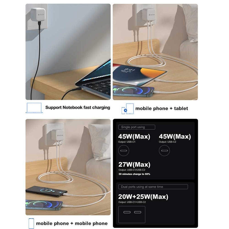این شارژر به دو پورت Type-C مجهز است که هر یک از آنها، ولتاژها و جریانهای مختلفی را پشتیبانی میکنند. این ویژگی باعث میشود که شارژر دیویا توانایی شارژ دستگاههای مختلف را به صورت بهینه و با سرعت بالا داشته باشد. ولتاژها و جریانهای پشتیبانیشده شامل موارد زیر است: