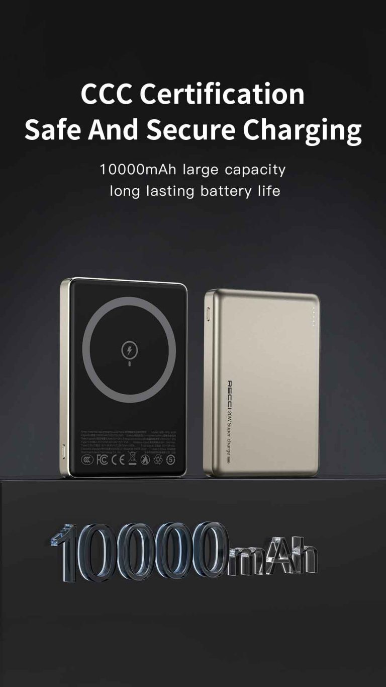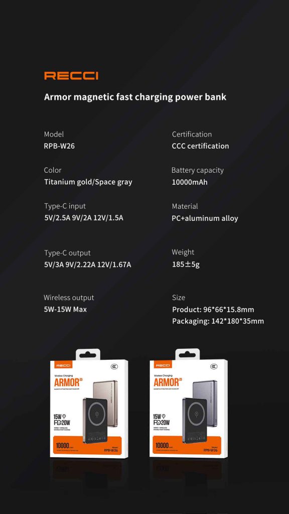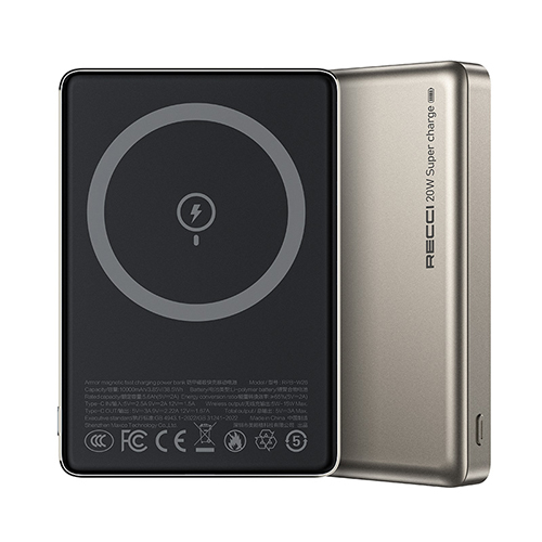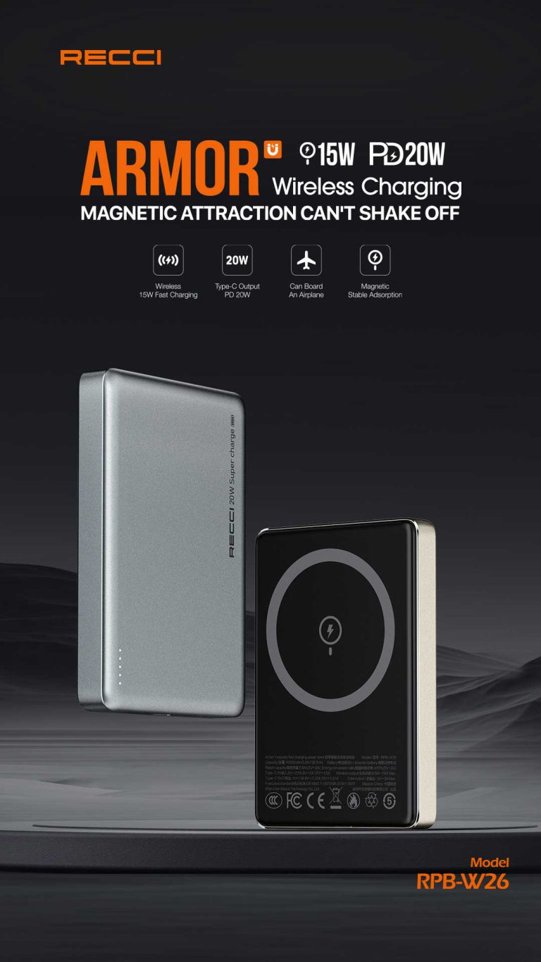 پاور بانک RECCI ARMOR مدل RPB-W26 با ظرفیت 10000 میلی آمپر یک انتخاب ایده آل برای افرادی است که به دنبال شارژ سریع و بی سیم هستند.