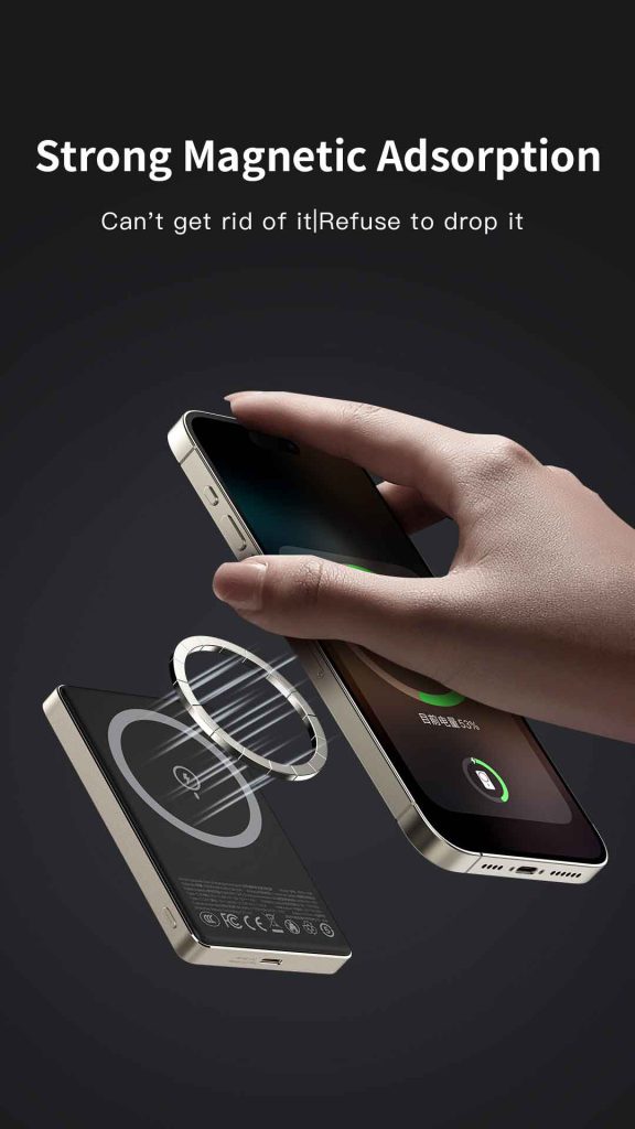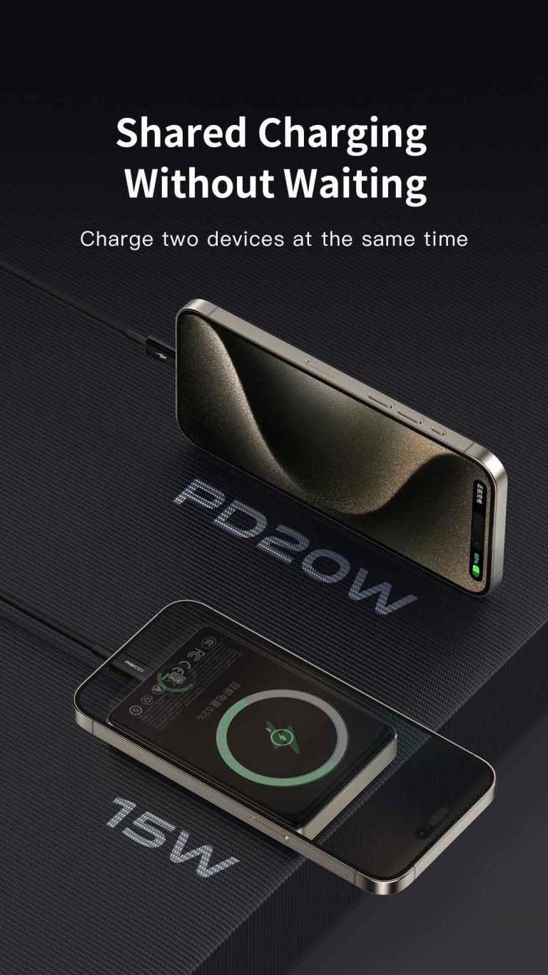 این پاوربانک از شارژ سریع بی سیم 15 واتی و شارژ سریع سیمی 20 واتی پشتیبانی میکند و امکان شارژ همزمان دو دستگاه را فراهم میسازد. همچنین با فناوری جذب مغناطیسی, دستگاه شما به صورت ایمن متصل میماند.