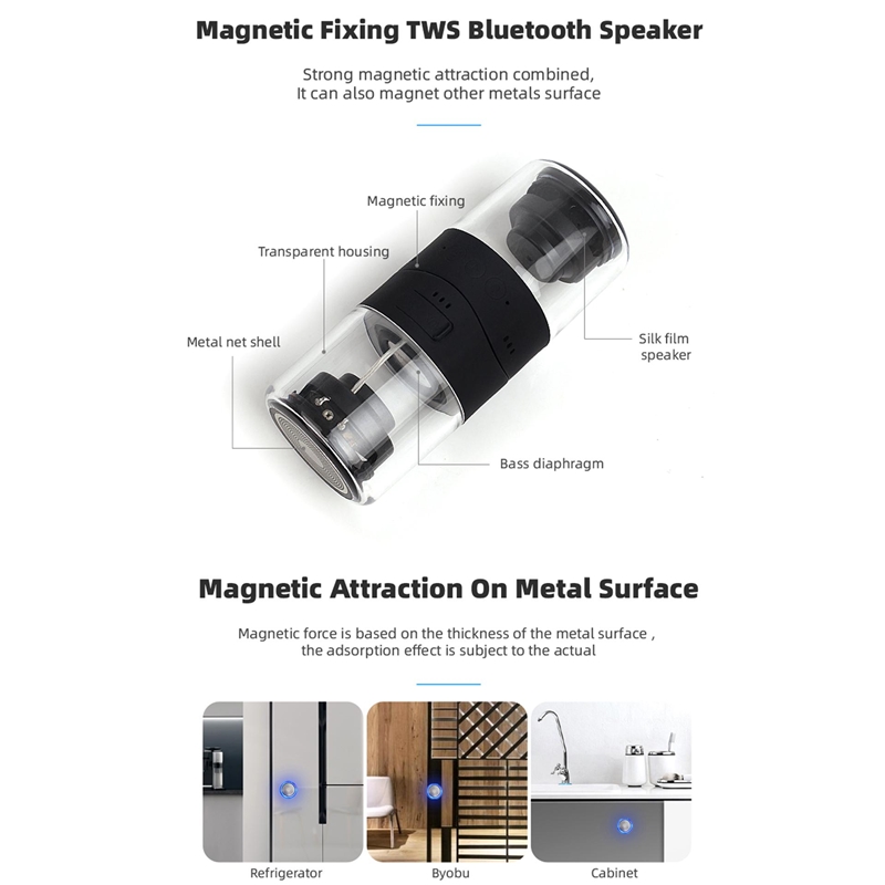 ظرفیت باتری در حالت استند بای: 20 ساعت پروفایل بلوتوث: A2DP / AVRCP دارای استاندارد IPX6 مقاوم در برابر نفوذ آب دارای دکمه کنترل موزیک و میزان صدا قابلیت پخش صدای استریو 360 درجه قابلیت اتصال دو اسپیکر با خاصیت آهنربایی دارای چراغ LED با چهار رنگ مختلف عمر طولانی مدت باتری وزن کم و قابلیت حمل آسان عمر باتری اسپیکر در حالت مکالمه: 6 ساعت قطر بلندگو: 40 میلی متر