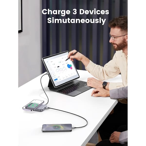 این پاور بانک قابلیت شارژ سه دستگاه به‌صورت همزمان را دارد. در این شرایط، شارژ دستگاه‌ها با توان ۱۵ واتی انجام می‌شود. این دستگاه از پورت‌های خروجی USB A و USB C پشتیبانی می‌کند تا امکان شارژ با کابل نیز وجود داشته باشد.