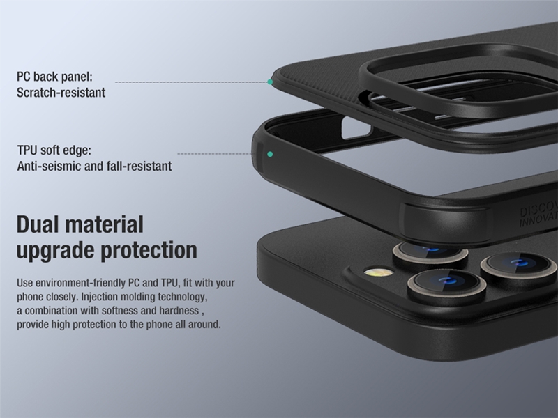 جنس کاور محافظ نیلکین Frosted Shield Pro از پلاستیک سخت PC و همین طور TPU سازگار با محیط زیست است. همین مسئله باعث شده تا این قاب علاوه برا دارا بودن جنسی خشک و سخت که بیشتر می توان آن را در قسمت پشتی قاب حس کرد، لبه هایی منعطف نیز داشته باشد و در برابر ضربات احتمالی از مقاومت بالایی برخوردار باشد. دور تا دور قاب از جنس TPU ساخته شده است، بنابراین می توان گفت که انعطاف پذیر بودن آن کمی باعث شده تا در برابر ضربه از خاصیت ارتجاعی خوبی برخودار باشد و به خوبی بتواند ضربه را تا حد زیادی دفع سازد. این قاب بصورت کامل قسمت پشتی و تمام اطراف گوشی شما را پوشش می دهد و فقط در قسمت های مورد نیازی مثل اسپیکر، میکروفون، دوربین و سنسورهای دیگر برش CNC خورده است. قابل توجه است که کلیدها نیز دارای پوشش هستند تا به خوبی و به طور کامل از آن ها محافظت شود. با این حال کار با آن ها همچنان راحت بوده و می توانید راحتی کاربرد گذشته خود را با آن ها داشته باشید. این نکته را در نظر داشته باشید که قاب در قسمت هایی که پورت وجود دارد، پوششی نداشته تا مانعی برای اتصال کابل و... برای شما ایجاد نکند.