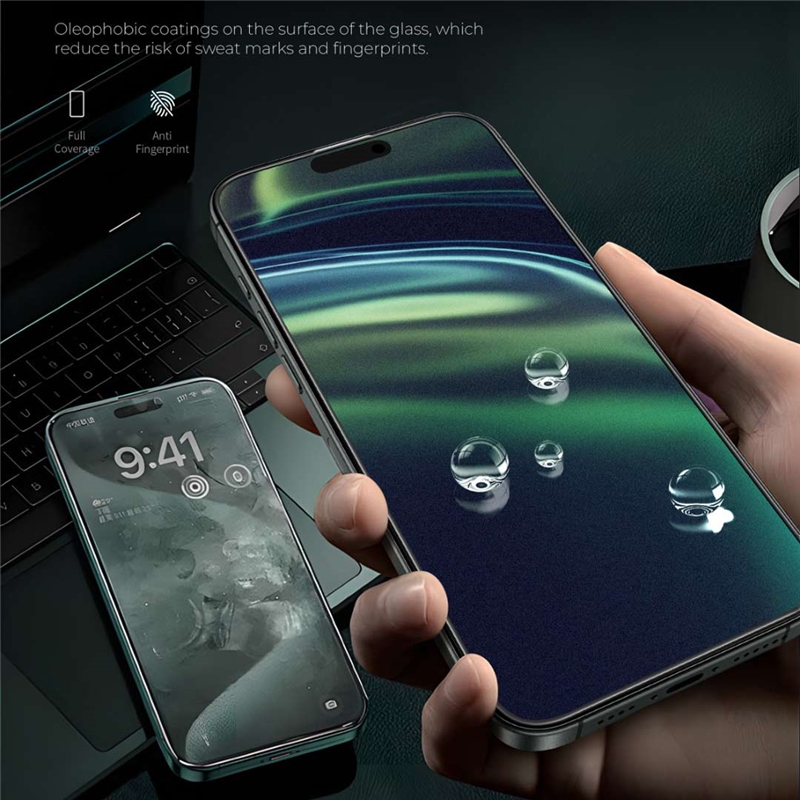 بر روی گلس گرین لاین iPhone 16 Pro Max 9H Steve Matte یک پوشش وجود دارد که مانع از باقی ماندن اثر انگشت روی آن می شود و باعث دیرتر کثیف شدن صفحه نمایش می شود. همچنین حرکت انگشتانتان را روی صفحه راحت تر می کند و اصطکاک بین صفحه و پوست دست شما را برای جابجایی راحت تر دستتان کمی کاهش می دهد. علاوه بر این، این گلس به نحوی طراحی شده که ذرات گرد و غبار و کثیفی روی صفحه گلس باقی نمانده و با یک بار دست کشیدن به سادگی پاک شود. به طور ویژه طراحی این گلس به نحوی بوده که ذرات از جنس چربی رو سطح آن باقی نمانده و یا پخش نشوند و در نتیجه حداقل دست نیز بتوانید آنها را پاک کنید.