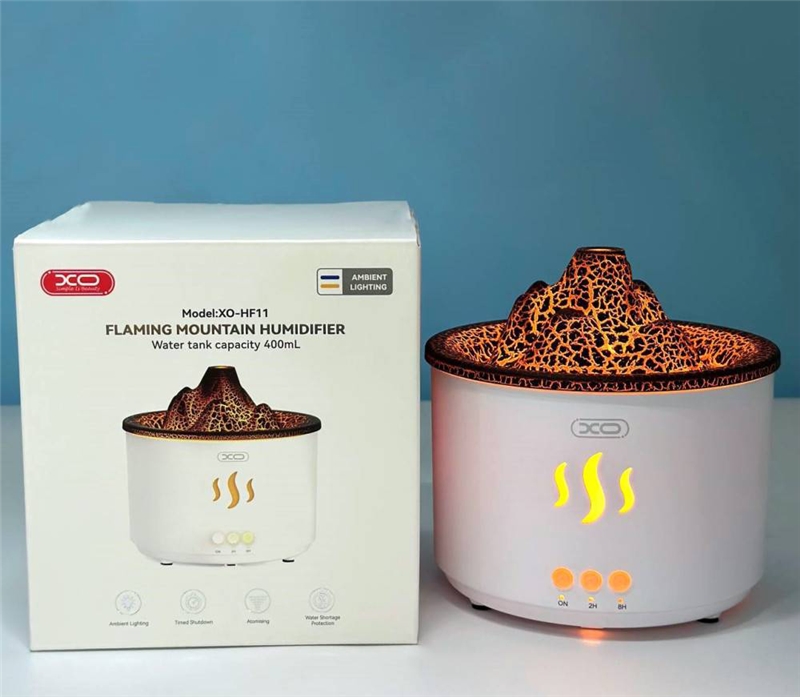 دستگاه رطوبت ساز XO-HF11 از جنس پلاستیک محکم ABS و PP ساخته شده است که مقاومت خوبی دارد. ابعاد این محصول برابر با 134*136*136میلی متر بوده و در نتیجه به راحتی میتوان آن را هر جایی قرار دارد. مخرن این دستگاه 400 میلی لیتر بوده که به راحتی می توانید مخزن را باز و پر کنید. همچنین این دستگاه مجهزی به سیستمی است که مانع از اتمام آب و آسیب دیدن دستگاه میشود. بخش بالای دستگاه که شبیه یک کوه آتشفشان است، در هنگام کار روشن شده و به 2 رنگ زرد و آبی درمیآید. منبع تغذیه دستگاه بخور سرد XO-HF11، کابل برق بوده که به پشت آن وصل میشود.