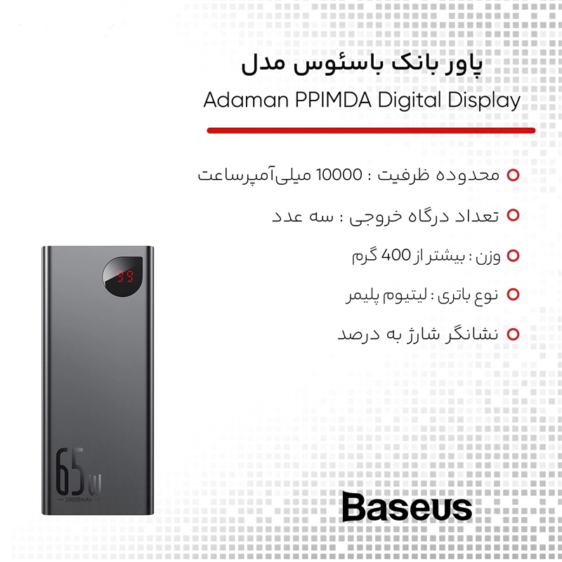 پاوربانک بیسوس مدل PPADM65 توان 65W ظرفیت 20000 میلی آمپر