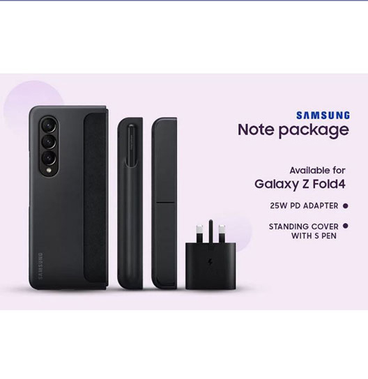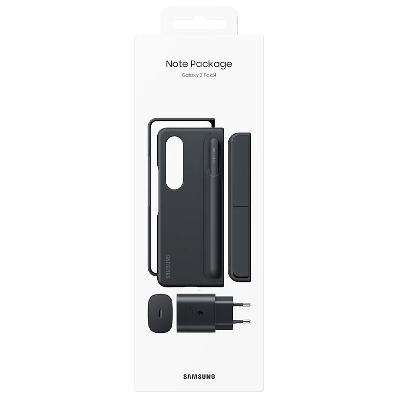 Note Package یکی از محصولات برند سامسونگ به حساب می آید که می تواند نیاز کاربران را به خوبی برآورده کند. در این محصول یک قاب محافظ برای گوشی موبایل Samsung Galaxy Z Fold 4 وجود دارد که قابلیت استند نیز دارد، که به شما این امکان را می دهد تا بدون نیاز به در دست گرفتن گوشی با قرار دادن آن بر روی میز، به استفاده از موبایل خود بپردازید. همین طور در این محصول یک قلم لمسی سامسونگ وجود دارد که به واسطه آن می توانید از گوشی خود راحت تر استفاده کنید و به کار هایی مانند طراحی و نوشتن با سادگی و دقت بیشتری بپردازید. در انتها نیز باید گفت که آداپتور شارژ 25 واتی با قابلیت شارژ سریع و PD 3.0 که دارای درگاه USB-C است( کابل شارژ باید جداگانه تهیه شود) نیز در این محصول وجود دارد که از همه این لوازم جانبی می توانید برای Galaxy Z Fold 4 استفاده کنید.