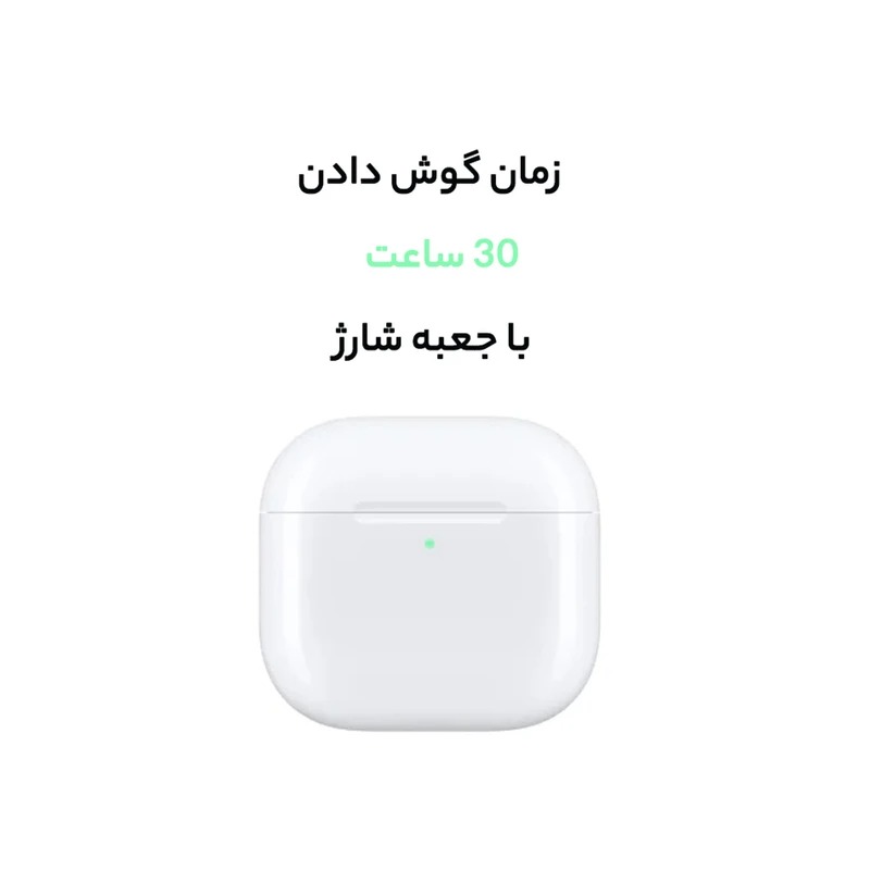 با استفاده از کیس شارژ ایرپاد 4 شما می‌توانید تا 30 ساعت به موسیقی گوش دهید. این زمان برای ایرپاد‌ها برابر 5 ساعت می‌باشد.