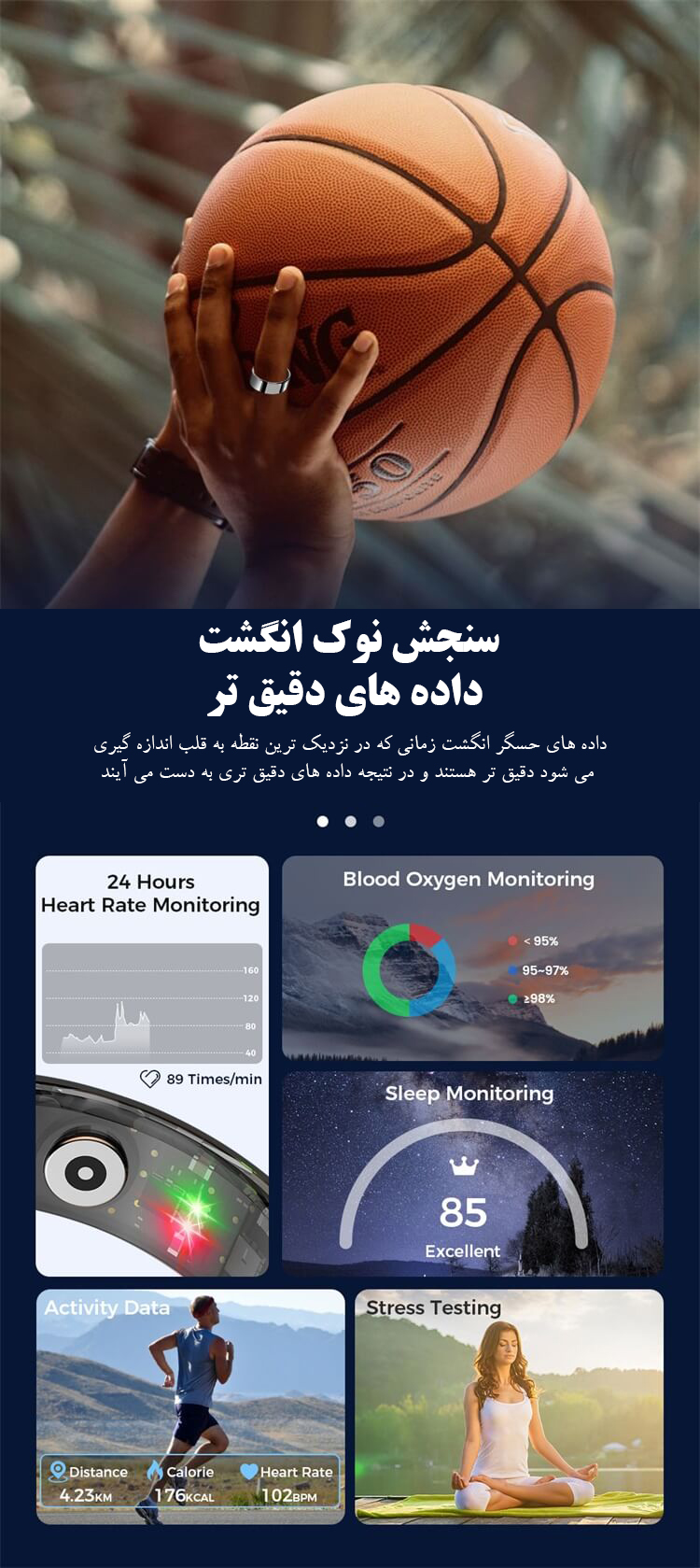 یکی از ویژگیهای برجسته حلقه هوشمند VR11، پایش سلامت ۲۴ ساعته است. این حلقه مجهز به حسگرهای پیشرفته برای اندازهگیری ضربان قلب، اکسیژن خون، فشار خون و حتی پایش استرس میباشد. با این قابلیتها، میتوانید به صورت دقیق از وضعیت جسمانی خود مطلع شوید و هرگونه تغییرات را به سرعت شناسایی کنید. همچنین، پایش خواب به شما کمک میکند تا الگوی خواب خود را تحلیل کرده و به بهبود کیفیت خواب بپردازید.
