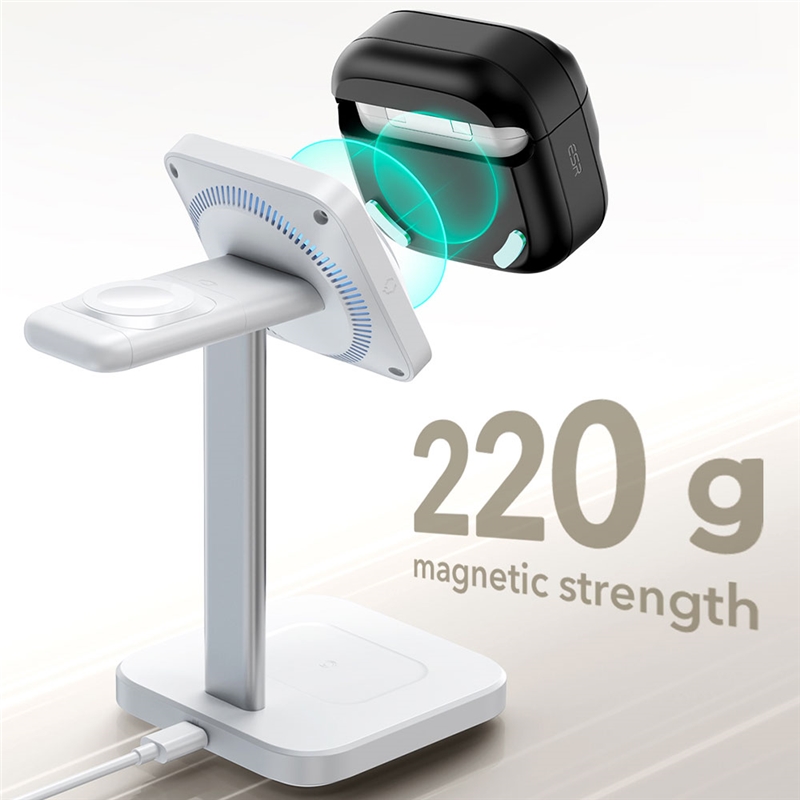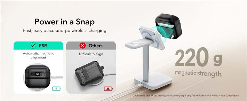 کاور ایرپاد ۴ ESR به طور کامل از شارژ بیسیم MagSafe پشتیبانی میکند. آهنرباهای قوی در قسمت پشت کاور به راحتی با شارژرهای MagSafe همراستا شده و شارژ بیسیم سریع و راحتی را فراهم میکنند. این ویژگی مخصوصاً برای کسانی که از ایرپاد ۴ با قابلیت لغو نویز فعال استفاده میکنند، بسیار مفید است.