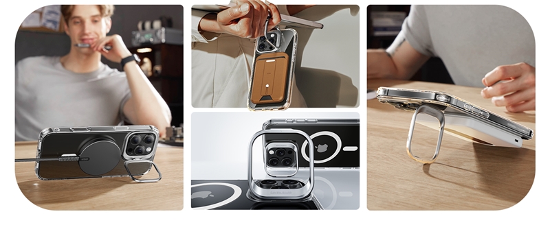 استند فلزی این قاب، به شکلی هوشمندانه در اطراف فریم دوربین تعبیه شده است و در هنگام عدم استفاده، کاملاً مخفی میماند. طراحی منحصربهفرد آن، حلقه مگسیف را بهطور کامل آزاد نگه میدارد و امکان تماشای ویدئو از زوایای دلخواه را به شما میدهد.