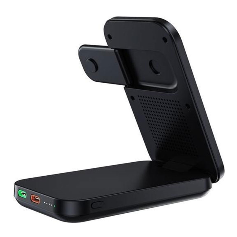 سایر توضیحاتظرفیت بالا: 10,000 میلی‌آمپر برای چندین بار شارژ. شارژ بی‌سیم 3 دستگاه همزمان: گوشی با 15 وات، ساعت و ایربادز هرکدام با 3 وات. پشتیبانی از Power Delivery: شارژ سریع 20 وات برای دستگاه‌های سازگار. سازگاری با MagSafe: برای گوشی‌های سری آیفون 12 به بعد. طراحی تاشو و قابل حمل: مناسب برای استفاده روزمره و سفر. پشتیبانی از USB-C و Lightning: امکان شارژ سیمی سریع. پایه یکپارچه: امکان قرارگیری امن و سازمان‌دهی دستگاه‌ها.