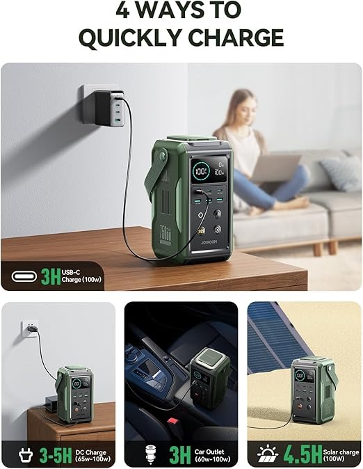 سایر توضیحاتظرفیت عظیم 75000 میلی آمپر ساعتی شارژ فوق العاده سریع 100 واتی طراحی نور جمع شونده 3C+3A، شارژ 6 دستگاه به طور همزمان صفحه نمایش دیجیتال بزرگ شارژ مجدد با ورودی 100 وات (حداکثر) از طریق درگاه DC یا با پنل های خورشیدی