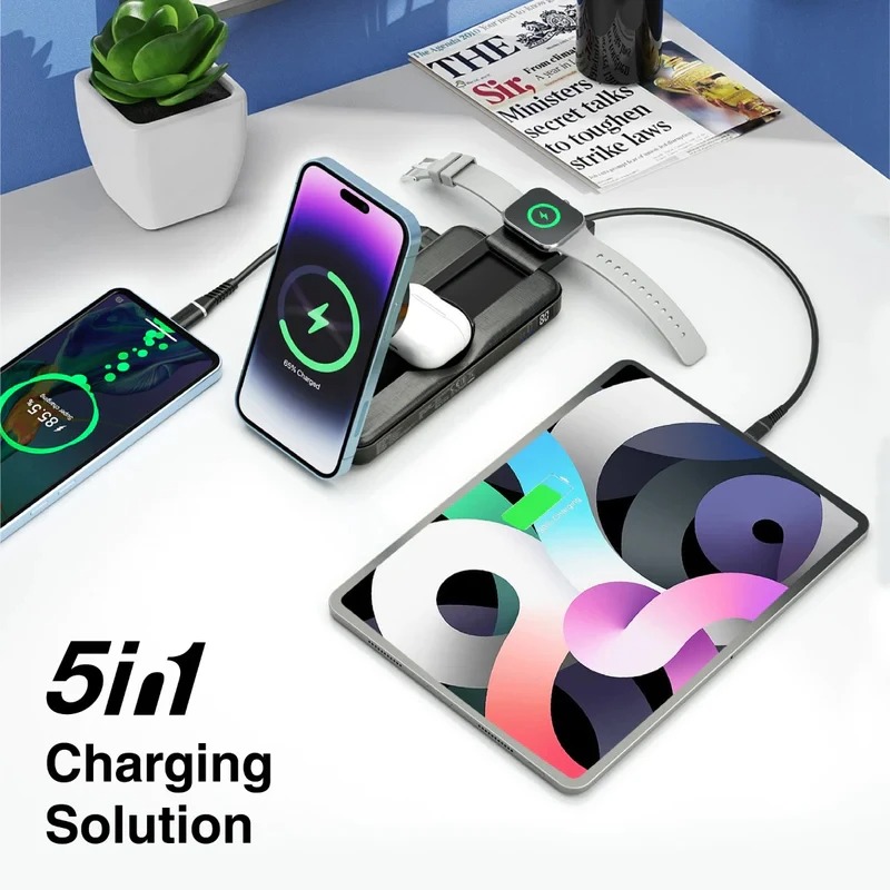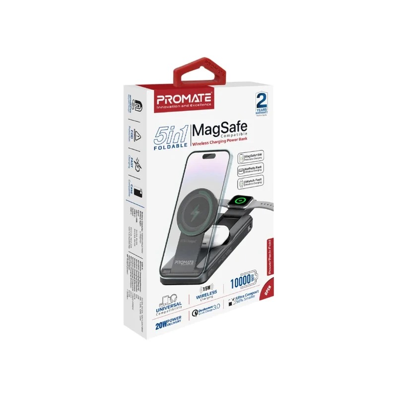 دیگر نیازی به چندین دستگاه برای شارژ ابزارهای مختلف الکترونیکی نخواهید داشت، شما میتوانید از PowerPack-Fold به عنوان راهحل کامل برای شارژ دستگاههای خود استفاده کنید. این پاوربانک با طراحی فوقالعاده جالب و منحصربهفرد دارای ماژولهای شارژ اختصاصی برای آیفون، اپل واچ و ایرپاد است، همچنین یک پورت USB-C PD 20 وات و یک پورت USB QC 3.0 18 وات دارد. این محصول یک باتری داخلی نیز دارد و به عنوان پاوربانک نیز عمل میکند. این پاوربانک با ظرفیت 10000 میلیآمپر میتواند به عنوان یک استند شارژ نیز مورد استفاده قرار گیرد. PowerPack-Fold از طریق پورت micro-USB یا پورت ورودی/خروجی USB-C شارژ میشود و همچنین از شارژ همزمان برای دستگاههای متصل به آن پشتیبانی میکند. این یعنی میتوانید از یک کابل برای شارژ گوشی و پاوربانک خود استفاده کنید. طراحی قابل حمل و شیک، همراه با شارژ سریع همزمان چند دستگاه، با طراحی داخلی خانه و محیطهای کار سازگاری دارد و نیاز روزانه شما به شارژ را برطرف میکند. مشخصات محصول: - 5 خروجی شارژ/ دارای ماژولهای شارژ اختصاصی برای آیفون، اپل واچ و ایرپادز، به همراه یک پورت USB-C PD 20 وات و یک پورت USB QC 3.0 18 وات - شارژ بیسیم 15 وات با فناوری MagSafe برای شارژ سریع و اتصال ایمن - ارائه توان خروجی 20 وات از پورت USB-C با فناوری Power Delivery - ارائه پد شارژ اپل واچ با توان خروجی 2 وات برای شارژ سریع و ایمن - طراحی سبک، تاشو و قابل حمل برای قرارگیری راحت در جیب کاربران / 50 درصد کوچکتر از شارژرهای مشابه/ دارای استندهای تاشو متصل به محصول - باتری داخلی لیتیوم پولیمر به ظرفیت 10000 میلیآمپرساعت/ شارژ پاوربانک از درگاه MicroUSB و USB-C - فناوری شارژ Quick Charge 3.0 در پورت USB-A برای شارژ سریع با توان 18 وات - پد شارژ اختصاصی ایرپادز با توان خروجی 5 وات - دارای سیستم اختصاصی ایمنی برای جلوگیری از افزایش دما، جریان اضافی و محافظت در برابر اتصال کوتاه