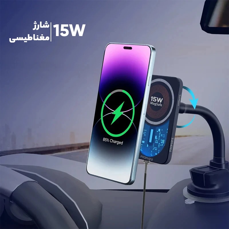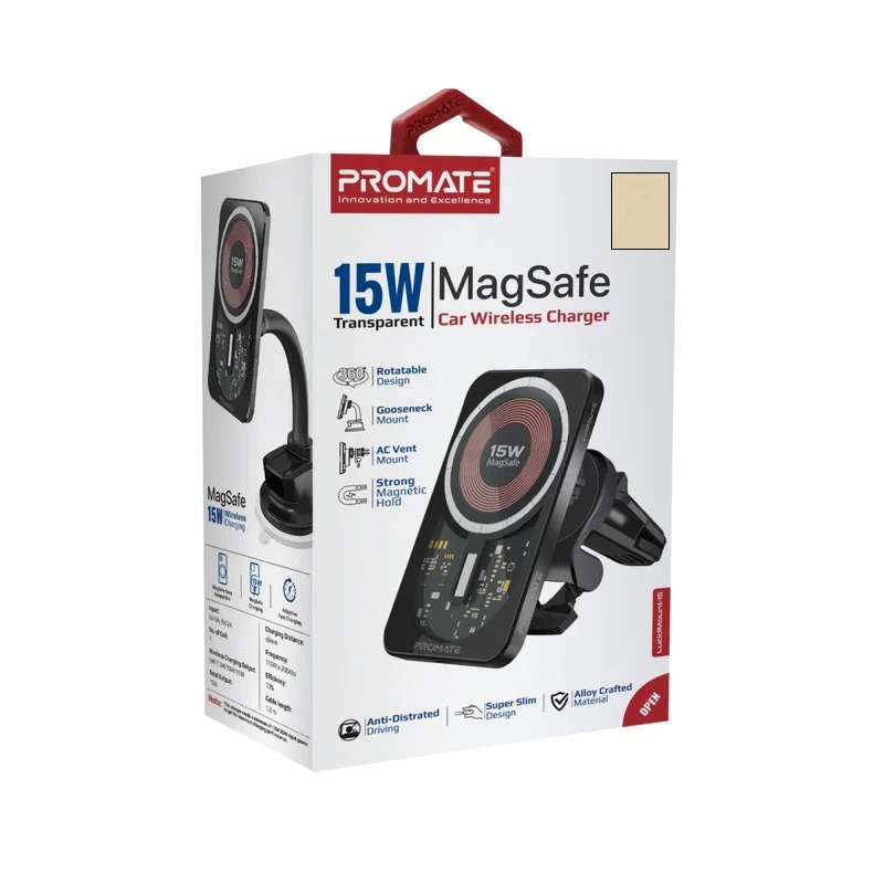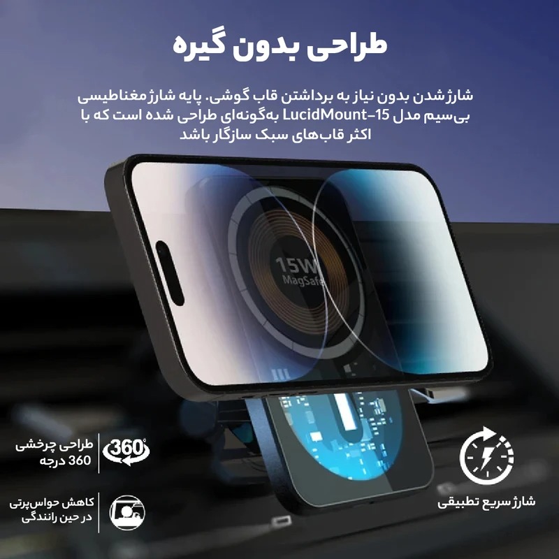 شارژر بیسیم و نگهدارنده موبایل LucidMount-15 راه حلی عالی برای خودروهای کاربران است که به بهبود تجربه آنها کمک میکند. این نگهدارنده موبایل از طراحی جالب شفاف استفاده کرده است، لبههای محصول آلومینیومی هستند و برای شارژ گوشی از فناوری MagSafe استفاده میکند. مگنتهای قدرتمند این محصول به کاربر اجازه شارژ سریع و بیخطر گوشی را میدهند و دیگر کاربر نگرانی از بابت سقوط گوشی خود نخواهد داشت. طراحی بدون گیره، به کاربر کمک میکند، به تمامی زوایای گوشی خود دید داشته باشد. همچنین کاربر میتواند از شارژ سریع و ایمن و استفاده همزمان بهرهمند شود.