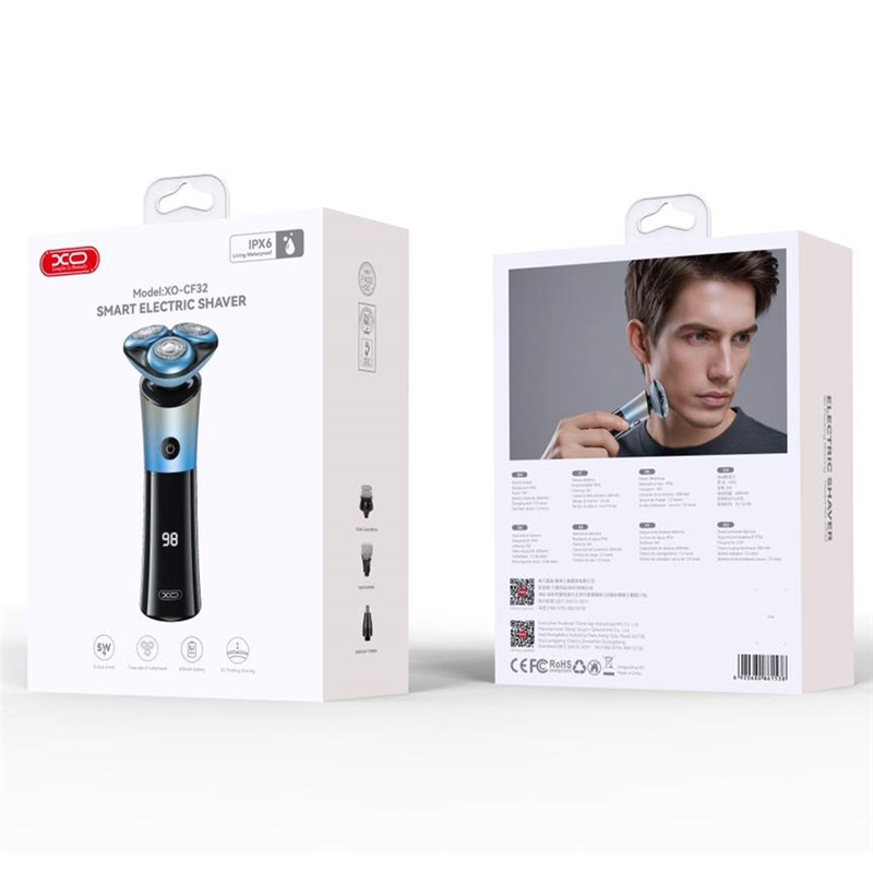 ریش تراش XO-CF32 در رنگ آبی زیبا عرضه شده و همراه با کابل USB و برس تمیزکننده ارائه میشود.