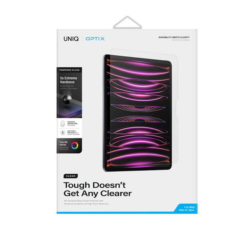 محافظ صفحه UNIQ Optix Clear با سختی ۹H و فناوری DustRepel™ برای نصب بدون حباب و تمیز، انتخابی مطمئن برای حفظ کیفیت نمایشگر آیپد شماست.
