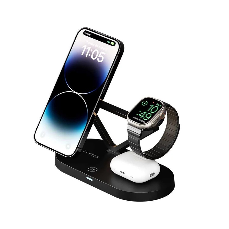 با شارژ بی سیم 5 در 1 Levelo Premio، محیطی بدون کابل و بدون دردسر را روی میز خود تجربه کنید. این پد شارژ نوآورانه برای راحتی کاربر طراحی شده است. این دستگاه از تکنولوژی MagSafe استفاده می‌کند و به شما امکان می‌دهد آیفون، اپل واچ و ایرپاد خود را بدون زحمت شارژ کنید. با فناوری شارژ سریع، دستگاه‌های شما در سریع‌ترین زمان ممکن شارژ می‌شوند. این پد شارژ با اجرای اقدامات حفاظتی در برابر جریان بیش از حد و ولتاژ بیش از حد، ایمنی دستگاه را در اولویت قرار می‌دهد. علاوه بر این، با چراغ های LED تعبیه شده در آن محیط اطراف شما را روشن می‌کند و در عین حال بسیار کاربردی و کارآمد است. پد شارژ بی سیم مگ سیف 5 در 1 Levelo Premio که با مواد درجه یک ساخته شده است، جلوه‌ای شیک و زیبا به اتاق شما می‎‌بخشد. با کابل‌های درهم خداحافظی کنید و از یک تجربه شارژ شیک و منظم لذت ببرید.