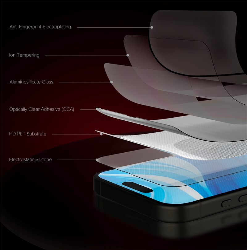 با استفاده از جدیدترین فناوری اتصال بدون درز، شیشه هوای محبوس شده را در حالی که به تلفن می‌چسبد برای نصب بدون حباب خارج می‌کند.