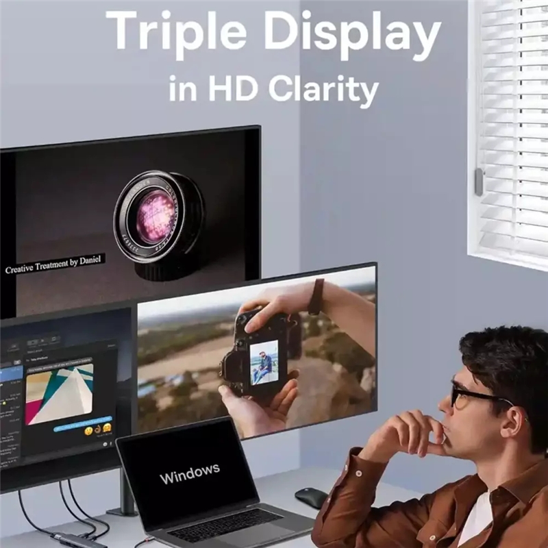 با پشتیبانی از HDMI 1 و HDMI 2 با کیفیت 4K، این هاب برای کاربرانی که نیاز به انتقال تصویر با وضوح بالا دارند، مناسب است. پورت HDMI 1 با کیفیت 4K@60Hz برای افرادی که به تماشای فیلم‌های 4K یا بازی‌های با کیفیت بالا علاقه دارند، یک انتخاب عالی است. پورت HDMI 2 با کیفیت 4K@30Hz نیز برای کارهایی مانند کنفرانس‌ها یا نمایش‌های عمومی مناسب است. علاوه بر این، پورت VGA با کیفیت 1080P@60Hz به شما این امکان را می‌دهد که به دستگاه‌های قدیمی‌تر یا نمایشگرهایی که تنها از VGA پشتیبانی می‌کنند، متصل شوید.