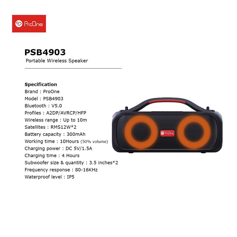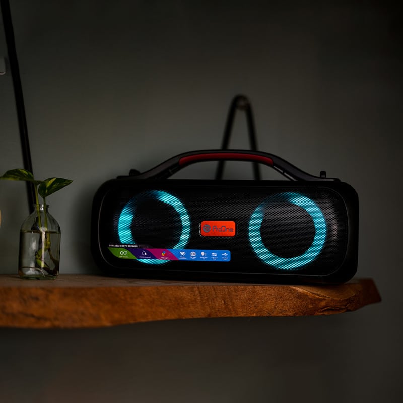 عموم اسپیکرهای ProOne با Siri اپل سازگار بوده و علاوه بر اتصال از طریق بلوتوث، امکان اتصال فلش مموری از طریق پورت USB-C و اتصال از طریق جک ۳. ۵ میلیمتری AUX را نیز فراهم نموده است. یک شیار رم MicroSD هم کنار اینها برای موارد خاص تعبیه شده است. این اسپیکر با باتری ۳۰۰۰ میلیآمپری کار میکند و خروجی صدای ۳۰ واتی آن قابلیت پاسخگویی به یک مهمانی با تعداد تا ۲۰ نفر را داراست. دو ساب ووفر ۷۶ میلیمتری در دو طرف اسپیکر، کیفیت BASS موزیک شما را تضمین میکنند. همچنین، با بهرهمندی از تکنولوژی TWS، این اسپیکر امکان اتصال با سایر اسپیکرها را برای پخش همزمان فراهم کرده و تجربه سینمای خانگی را به شما ارائه میدهد. یعنی با یک اسپیکر دیگر هم Pair شده و امکان پخش همزمان را برای شما فراهم میسازد. باتری این اسپیکر به مدت ۱۰ ساعت پخش موسیقی فراهم میکند و زمان شارژ کامل آن تا ۴ ساعت میباشد.