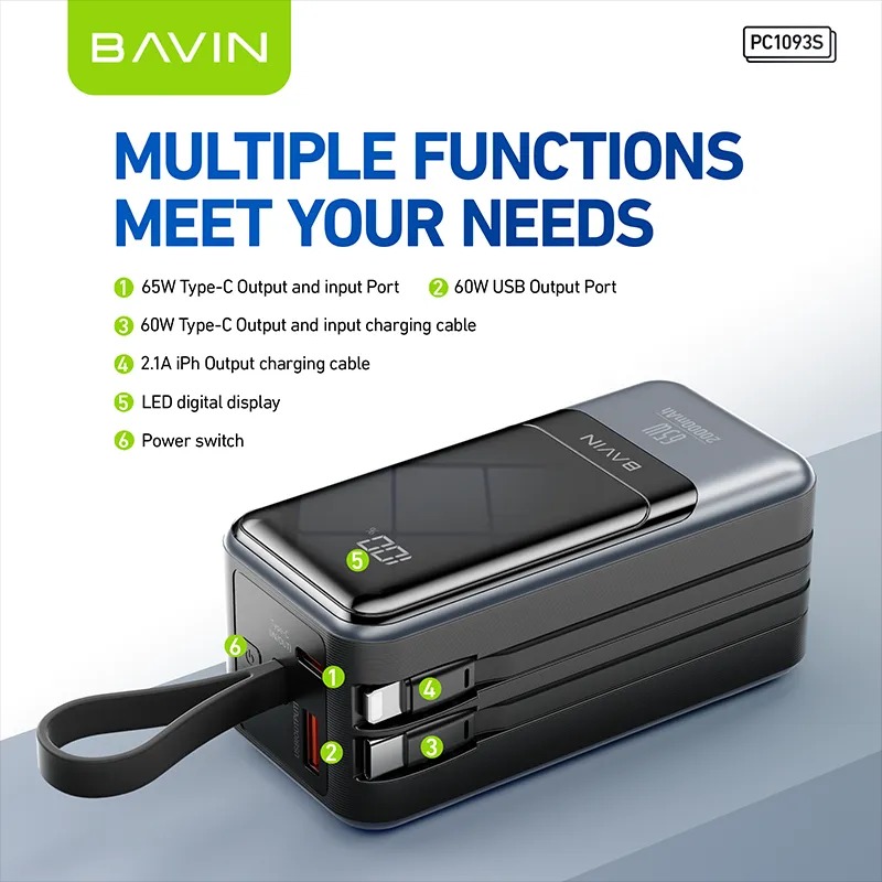 پاوربانک بیست هزار Bavin PC1093S با دو کابل داخلی (Type-C و Lightning) و درگاههای USB و Type-C به شما امکان میدهد تا دستگاههای مختلف خود را به راحتی شارژ کنید. کابل Type-C این محصول قابلیت ورودی و خروجی تا 20 ولت و 3.25 آمپر را دارد و کابل Lightning با خروجی 5 ولت و 2.1 آمپر، نیازهای دستگاههای اپل را پوشش میدهد. این تنوع درگاهها در پاوربانک 20000 باوین PC1093S، انعطافپذیری بیشتری را برای کاربران فراهم میکند.