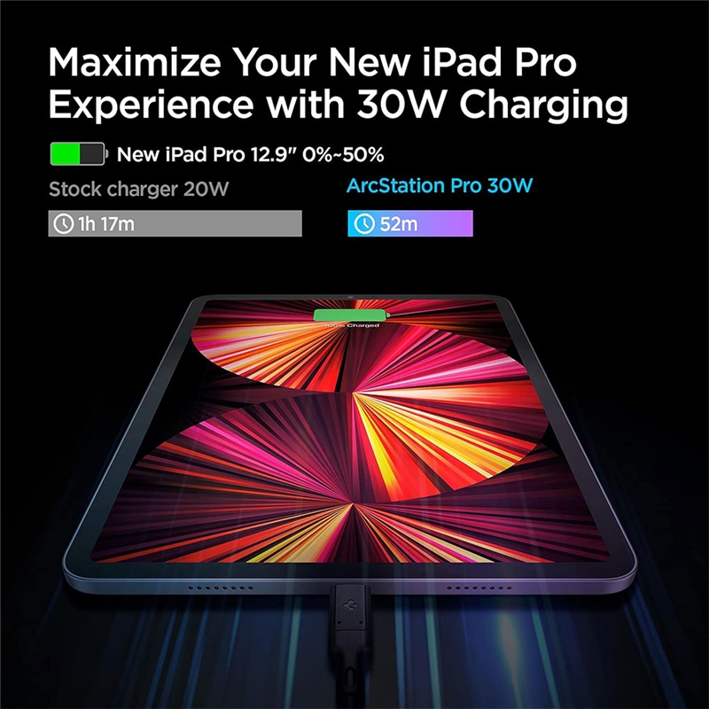 شارژر اسپیگن ArcStation™ Pro GaN با خروجی ۳۰ وات و پشتیبانی از Power Delivery 3.0، امکان شارژ سریع دستگاههای مختلف از جمله گوشیهای هوشمند، تبلتها و لپتاپها را فراهم میکند. این شارژر میتواند گوشیهای آیفون سری ۱۲ را در مدت ۳۰ دقیقه تا ۵۰ درصد شارژ کند.