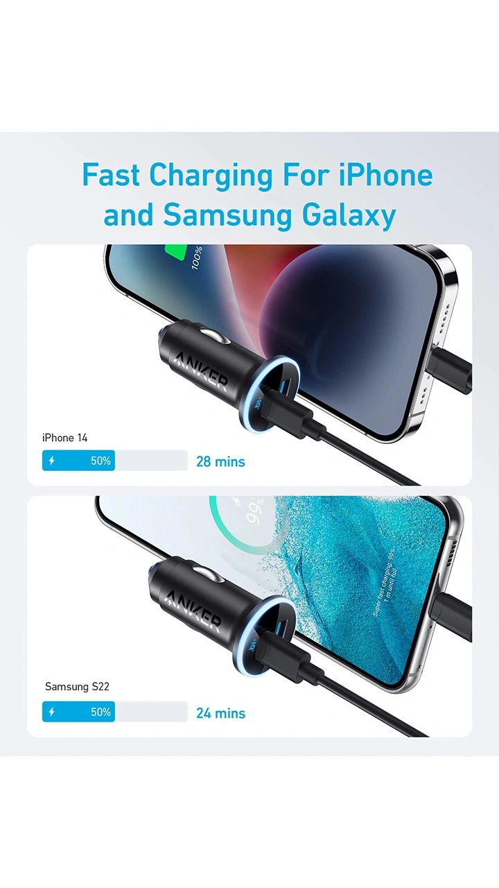 شارژر فندکی 52.5 وات 2 پورت انکر مدل A2735 برای شارژ دستگاه از طریق سوکت فندکی خودرو استفاده می شود. این محصول دو درگاه خروجی دارد که یکی USB و دیگری USB – C است. در نتیجه این شارژر برای شارژ دو دستگاه به صورت هم زمان نیز کاربرد دارد.