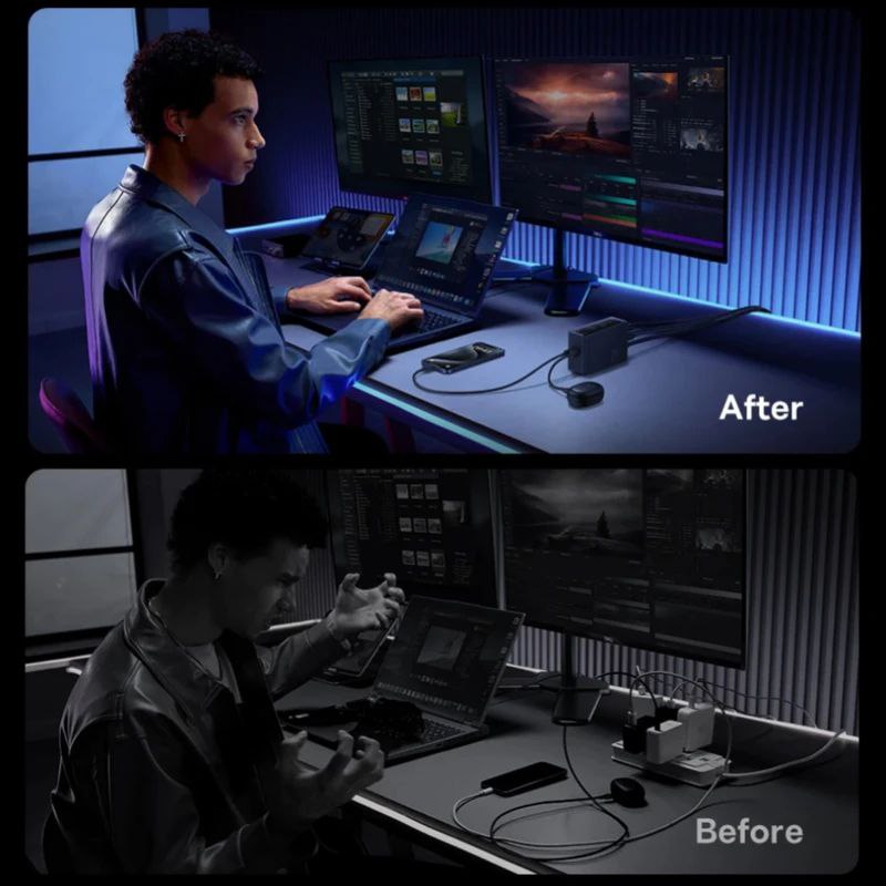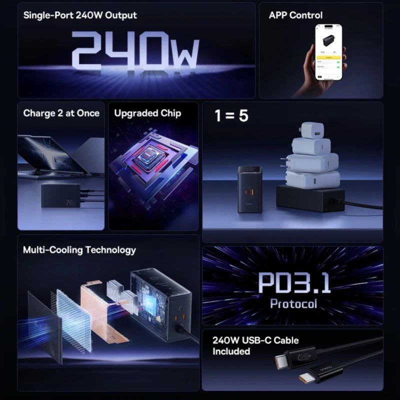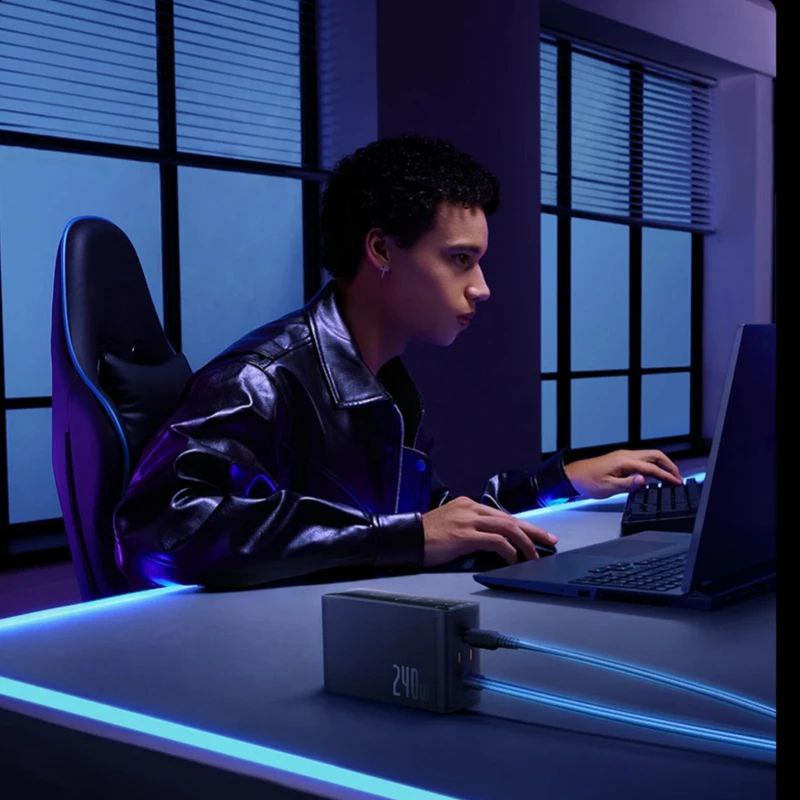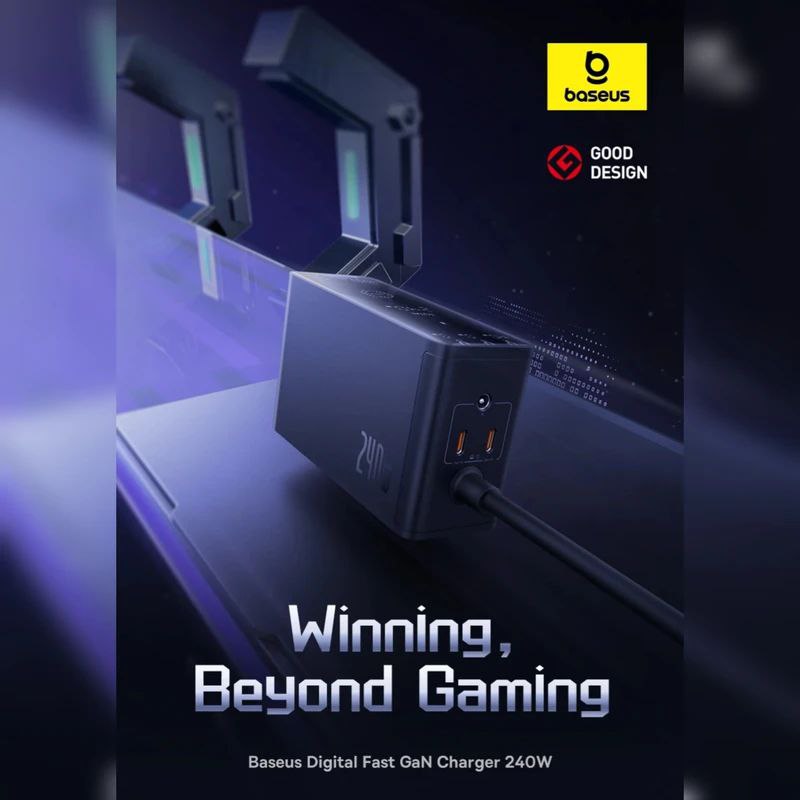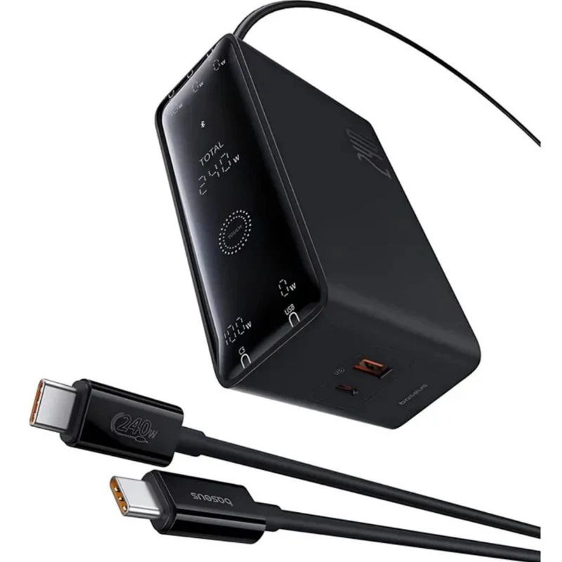 هاب شارژر Baseus CCGAN240CE با حداکثر توان خروجی 240 وات و داشتن 5 پورت خروجی متشکل از 3 درگاه Type-c، یک درگاه USB و یک درگاه DC می‌تواند انتخاب خوبی برای میز کارتان باشد. به کمک این تعداد پورت می‌توانید همزمان چند وسیله مدنظر خود را شارژ کنید. هاب شارژر 5 پورت بیسوس CCGAN240CE دارای چندین پروتکل شارژ سریع از جمله PD3.1 است. از جمله با این شارژر می‌توانید گوشی‌های آیفون 14 و 15 خود را بالاترین سرعت شارژ کنید. از پورت Type-cشماره 1 این هاب شارژر به دلیل توان بالای خود برای شارژ لپ تاپ و مک بوک خود نیز می‌توانید استفاده کنید.توان بالای این هاب شارژ به حدی است که شما می‌توانید همزمان دو مک بوک 16 پرو را با آن شارژ کنید. در این صورت یک مک بوک 16 پرو با توان 140 وات شارژ شده و ظرف تنها 30 دقیقه به 55 درصد رسیده و مک بوک 16 پرو دیگر با توان 100 وات شارژ شده و ظرف 30 دقیقه به 45 درصد شارژ می‌رسد.