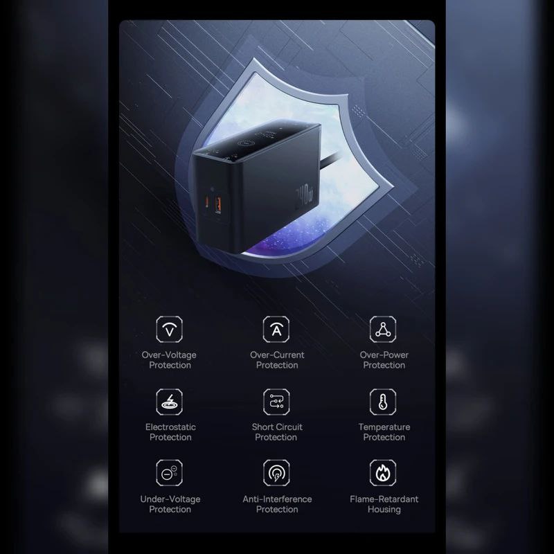 هاب شارژر 5 پورت Baseus CCGAN240CE دارای بدنه نسوز بوده که باعث ایمنی این محصول می‌شود. علاوه بر این دارای 9 مورد استاندارد ایمنی بوده که شامل این موارد است: