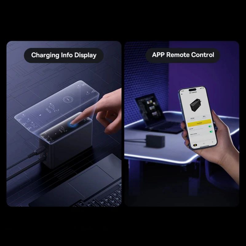 برای کنترل راحت‌تر هاب شارژر 5 پورت بیسوس CCGAN240CE دو امکان بر روی این هاب شارژ قرار داده شده است: یکی صفحه کنترل لمسی و دیگری اپیکیشن. صفحه LED قرار گرفته بر روی این هاب شارژر تنها با یک بار شارژ روشن شده و اطلاعاتی در قبیل توان شارژ را در اختیار شما می‌گذارد. همچنین شما می‌توانید با یک اپیکیشن نیز به این هاب شارژ وصل شوید. در این حالت شما می‌توانید بسته به نیاز خود تا فاصله 10 متری از هاب شارژر هر کدام از درگاه‌ها را که می‌خواهید کنترل کرده و خاموش و روشن کنید. همچنین می‌توانید مواردی مثل دما را نیز روی این اپ چک کنید. کاربردی‌ترین قابلیت اما این است که شما‌ می‌توانید به کمک این اپیکیشن تایمر نیز برای هر کدام از این درگاه‌ها تنظیم کنید.