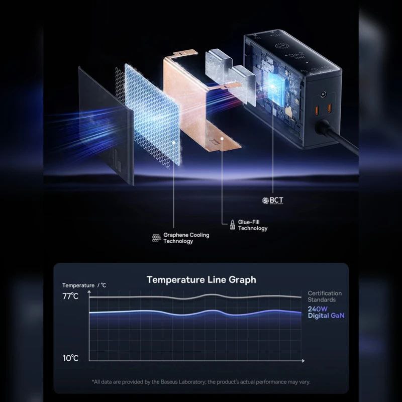هاب شارژر بیسوس CCGAN240CE دارای تکنولوژی GaN است. فناوری GaN یک فناوری از نوع نسل سوم است که مزایای بسیار زیادی در اختیار شما می‌گذارد. بر خلاف شارژرهای معمول، در ساخت شارژرهای با تکنولوژی GaN از مواد نیمه هادی استفاده می‌شد که بسیار سبک‌تر بوده و همچنین گرمای کمتری ایجاد می‌کنند. از سویی این مواد رسانایی بیشتری نیز دارند. این ویژگی‌ها باعث ایمنی و شارژ سریع‌تر در این نوع شارژرها می‌شود. برای مثال در هاب شارژر 5 پورت بیسوس CCGAN240CE مواد GaN به کار رفته، هم موجب دمای تا 20 درصد کمتر و حجم بسیار کمتر به خصوص با توجه به توان بالای این هاب شارژر می‌شود.