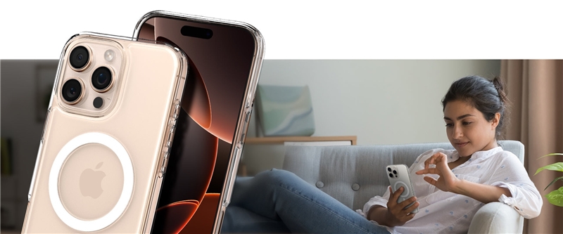 قاب اسپیگن Ultra Hybrid (MagFit) با طراحی شفاف خود، زیبایی اصلی آیفون ۱۶ شما را به‌طور کامل نشان می‌دهد. این قاب از ترکیب پلی‌کربنات (PC) و ترموپلاستیک پلی‌اورتان (TPU) ساخته شده است که نه تنها ظاهری زیبا ایجاد می‌کند، بلکه مقاومت بالایی نیز دارد.
