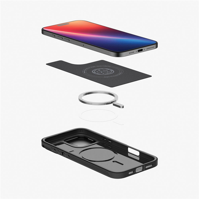 قاب Spigen Optik Armor (MagFit) از فناوری Air Cushion در گوشهها و ساختار مقاوم دو لایه برای جذب ضربات استفاده میکند.