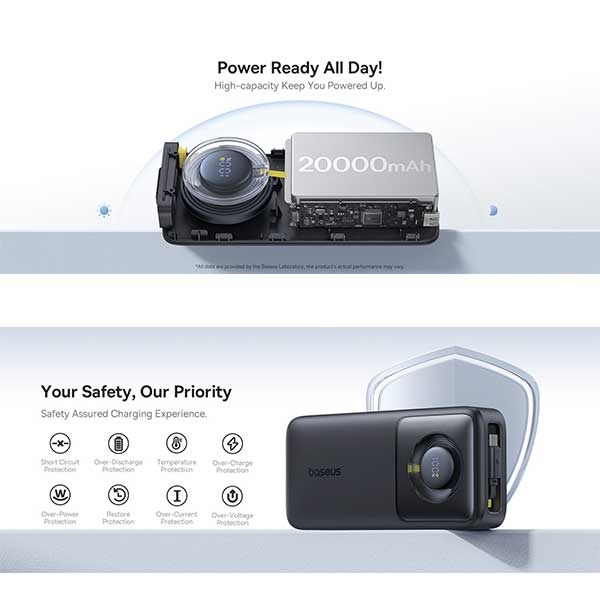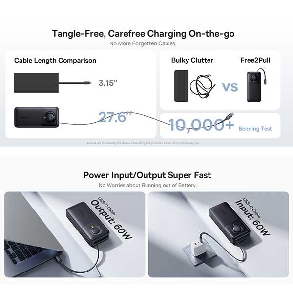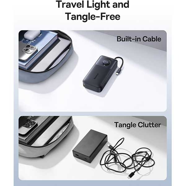 یکی از ویژگیهای بسیار کاربرپسند این پاوربانک، کابل جمعشونده تایپ سی است که به همراه پاوربانک ارائه میشود. این کابل نه تنها از گم شدن آن جلوگیری میکند، بلکه فضای کمی را در کیف یا جیب شما اشغال میکند. کابل تایپ سی به شما این امکان را میدهد که به راحتی دستگاههای مختلف خود را شارژ کنید، بدون اینکه نیاز به حمل کابلهای اضافی و شلخته داشته باشید. این طراحی جمعوجور باعث میشود که این پاوربانک به گزینهای مناسب برای سفر و استفاده روزمره تبدیل شود.