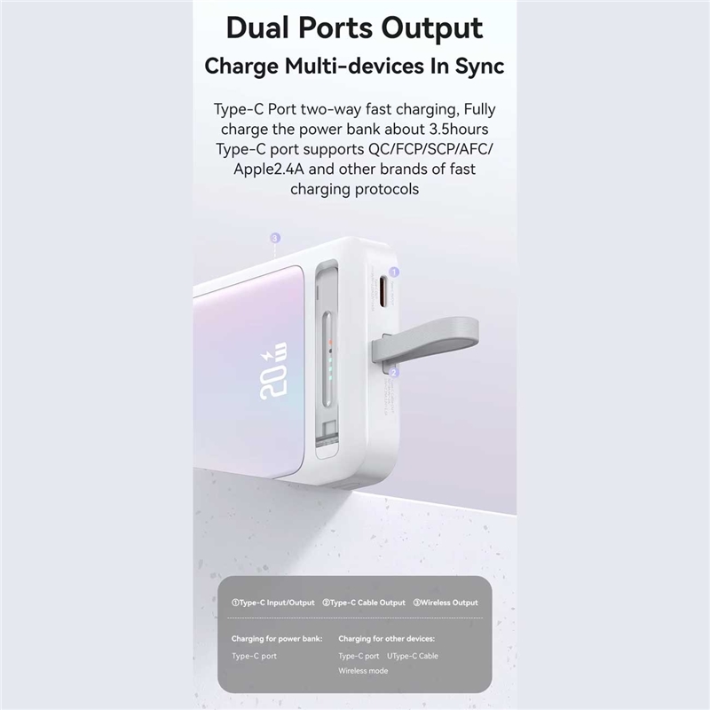 پورت Type-C پاوربانک وایرلس یوسمز cd219 نهتنها برای خروجی سریع استفاده میشود، بلکه قابلیت شارژ سریع خود پاوربانک را نیز دارد و تنها در 3.5 ساعت کاملا شارژ میشود. میتوانید همزمان دو دستگاه را به صورت سیمی و بیسیم شارژ کنید.