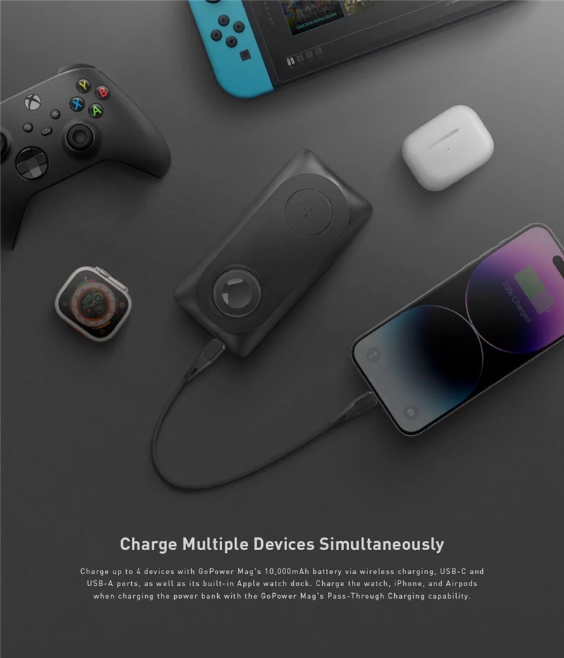 قابلیت شارژ همزمان ۴ دیوایس با مجموع توان خروجی ۲۲٫۵ وات ( دو دستگاه با کابل ، یک دستگاه وایرلس و یک اپل واچ )