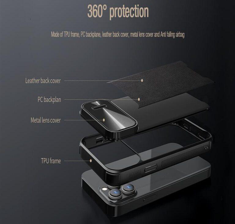 شرکت نیلکین بار دیگر با طراحی جدید اقدام به تولید قاب های کمشیلد چرمی ( CamShield Leather S ) گوشی آیفون های سری 14 کرده است این قاب چرمی حافظ لنز دار برند نیلکین در عین سادگی یک جلوه ی ظاهری مجللی به دستگاه شما میدهد که بخاطر طراحی کلاسیک آن می باشد.جنس این محصول ترکیبی از مواد سخت، نرم و چرم (TPU-PC-Leather S) میباشد که با ظرافت تمام کنار هم دیزاین شده است و دستگاه شما از آسیب های احتمالی مانند افتادن و خراشیدگی در امان نگه میدارد. پشت این قاب هم موادی به کار رفته تا از چرب شدن و کثیف شدن و همچنین ماندن اثر انگشت روی دستگاه شما جلوگیری کند؛ک ترکیب عالی از چندین لایه ی نرم، سخت و چرم محافظتی و همچنین کپسول هایی که چهار طرف گوشی شما وجود دارد ،برای هم ضد خش بودن و هم ضد آسیب دیدگی. این قاب محافظ یک تیکه، در قسمت پشت از مواد PC و روکش چرم، در قسمت محافظ لنز دوربین از مواد سخت مرغوب PC و در قسمت دور تا دور و لبه های قاب از مواد TPU که کمی انعطاف پذیر است ساخته شده است. برش های گارد کمشیلد در قسمت پورت ها و دوربین با دقت بسیار بالایی انجام شده در ثانی پوششی از همان جنس منعطف TPU بر روی دکمه ها تعبیه شده که خود محافظی برای دکمه های گوشی است.طراحی شکیل و منحصر به فرد این محصول و امکان پوشش 360 درجه ای در تمامی قسمت های گوشی، خیال کاربر را از بابت حفاظت و اندازهی دقیق آن راحت میکند. این قاب سبک و خوش دست بوده و در قسمت لنز دوربین محافظ کشویی دارد که از لنز دوربین در برابر سخت ترین ضربه ها مرافبت میکند و برای محافظت از حریم خصوصی شما هم کاربردی است. در زیر درب کشویی قاب، فنری قرار داده شده است که باعث راحت تر باز و بسته شدن درب کشویی میشود که از طول عمر بسیار بالایی برخوردار است.