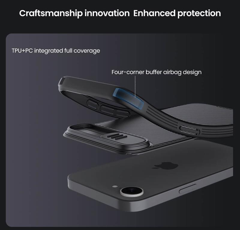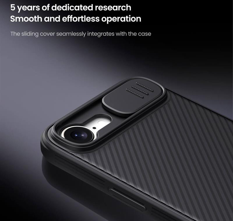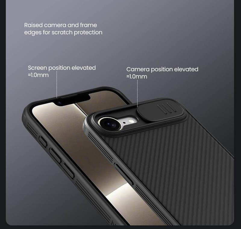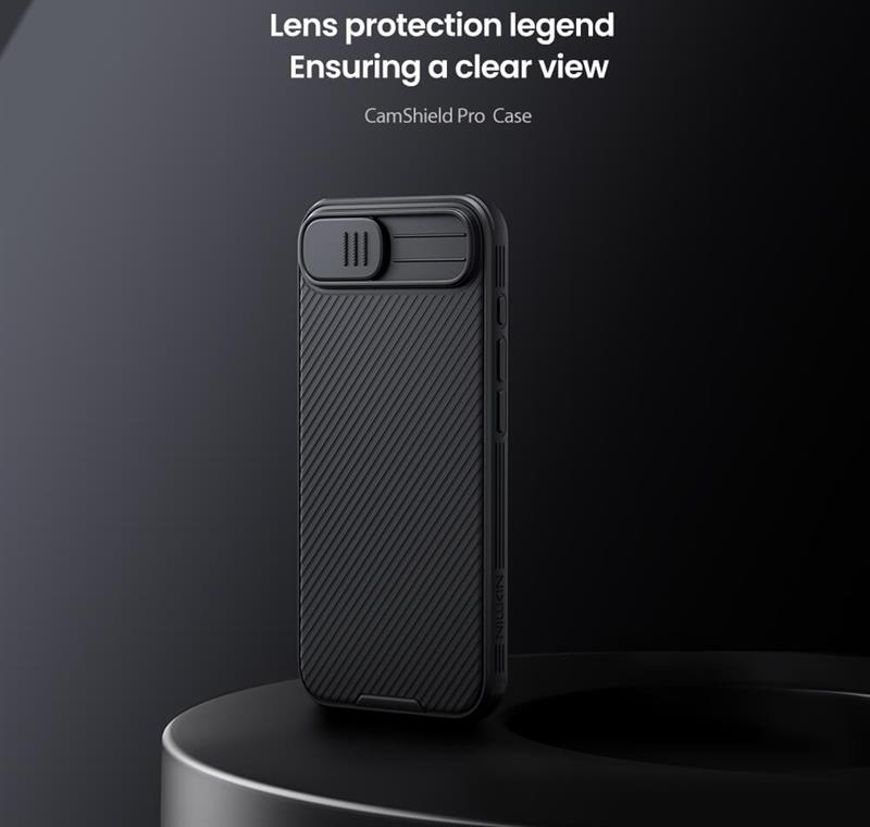 کاور نیلکین کم شیلد پرو CamShield pro یک محافظ بسیار خوب برای مراقبت از لنز دوربین و بدنه اسمارت فون شما است. این کاور طراحی بسیار زیبایی دارد و نسبت به سری اول کم شیلد جنس و متریال بهتری دارد . کم شیلد پرو حس پلاستیک سخت را به شما نمی دهد و البته بخاطر خطوط منظم پشت کاور اسمارت فون از دست شما لیز نمی خورد و از جنس پلی کربنات است. همچنین این قاب مقاوم در برابر لکه و اثر انگشت وچربی است طراحی این محصول بسیار استاندارد است و دستگاه شما به خوبی و راحتی در قاب قرار می‌گیرد و به دلیل دقتی که در برش محل کلید و پورت ها و دوربین شده است محدودیتی در لمس دکمه ها و پورت و…. ایجاد نمی‌کند. این قاب بسیار خوش دست است و طوری طراحی شده ک لیز نمی‌خورد علاوه بر ظاهر زیبا درپوشی در پشت دوربین به صورت کشویی قرار گرفته که از لنز دوربین شما محافظت می‌کند و ضربه گیر بسیار قوی است و از کیفیت بسیار بالایی برخوردار است. برش های گارد CamShield Pro در قسمت پورت ها و دوربین با دقت بسیار بالایی انجام شده و پوششی از همان جنس منعطف TPU بر روی دکمه ها قرار گرفته است که خود محافظی برای دکمه های گوشی کاربر است. طراحی این قاب گوشی اپل نکته ی بسیار حائز اهمیتی دارد که این مدل گارد Nillkin را از بقیه ی ،قاب های نیلکین متمایز میکند آن هم درب کشویی است که در پشت گارد برای محافظت از لنز دوربین گوشی تعبیه شده است که بسیار مناسب برای کابرانی است که از بابت خراشیدگی و ضربه به لنز دوربین موبایل نگرانی دارند، درب کشویی لنز را ببندد تا به لنز گوشی ضربه یا خط و خشی وارد نشود و زمان استفاده از دوربین درب کشویی را کنار میزند.