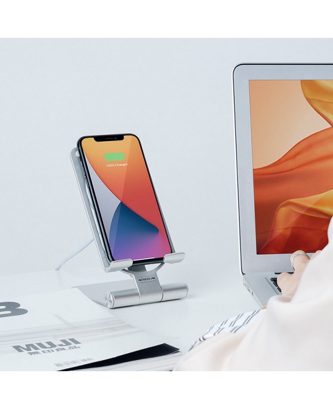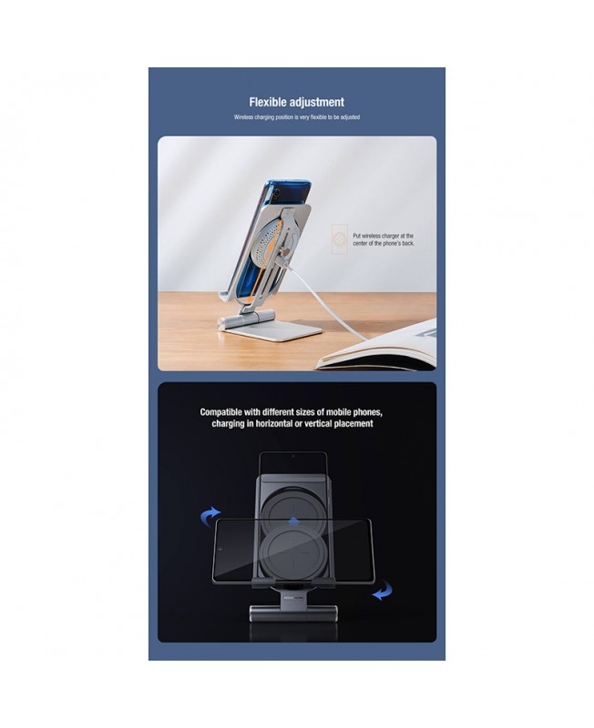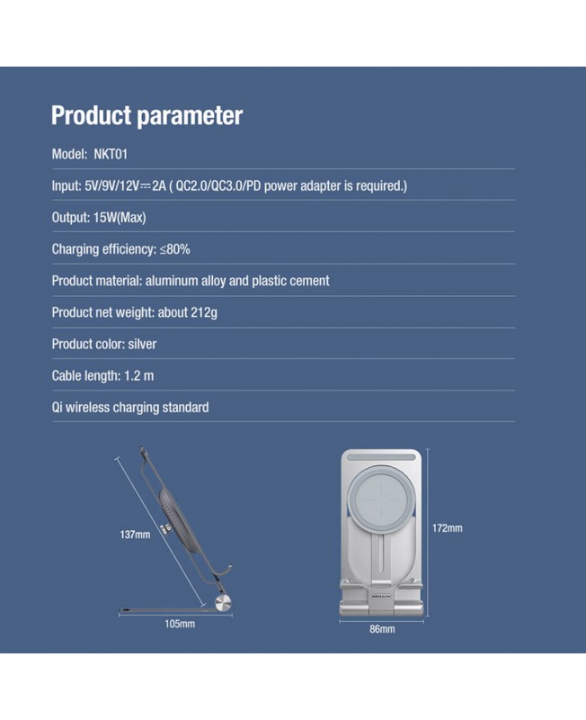 این شارژر بی سیم توسط کمپانی نیلکین تولید شده و بدنه ی آن از جنس آلیاژ آلومینیوم می باشد. یکی از ویژگی های این پایه وایرلس شارژ ، قابلیت تنظیم زاویه آن می باشد که به کمک آن می توانید NKT01 را در زاویه دلخواه تنظیم کنید. توان خروجی نهایی Nillkin PowerHold Mini Wireless Charging Stand برای شارژ بی سیم 15 وات می باشد.