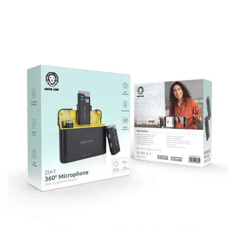 میکروفون 3 در 1 Green Lion مدل GN3IN1MIC360D کمک صوتی بی سیم شما است که تا 21 ساعت آماده ضبط صدایی شفاف است! به لطف فناوری حذف نویز هوشمند آن، با نویز پس‌زمینه خداحافظی کنید و به ضبط‌ صداهای های واضح سلام کنید. به راحتی با جفت شدن خودکار به هر دستگاهی متصل می‌شود و صدای 360 درجه آن به شما اطمینان می‌دهد که هرگز صدایی را از دست نخواهید داد. به علاوه، قابل حمل و همه کاره است و دارای دو خروجی  USB-C و Lightning  برای گوشی های اندروید و آیفون میباشد.