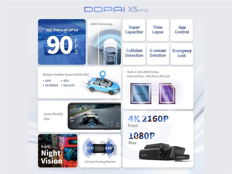 دوربین خودروی Xiaomi DDpai X5 Pro دارای سنسور IMX415 ساخت شرکت بزرگ سونی می باشد که به لطف 7 لنز اپتیکال و زاویه دید 140 درجه می تواند با کیفیت 4K و رزولوشن 3840*2160 و با 30 فریم بر ثانیه یا کیفیت FHD و رزولوشن 1920*1080p با 90 فریم بر ثانیه و دیافراگم F1.8 فیلم برداری کند.