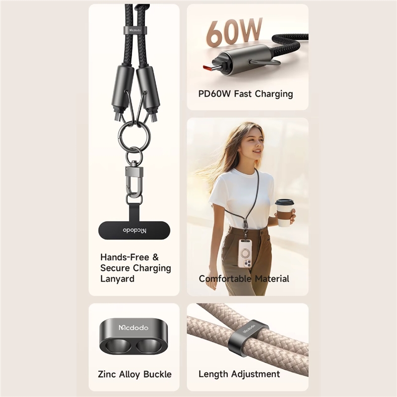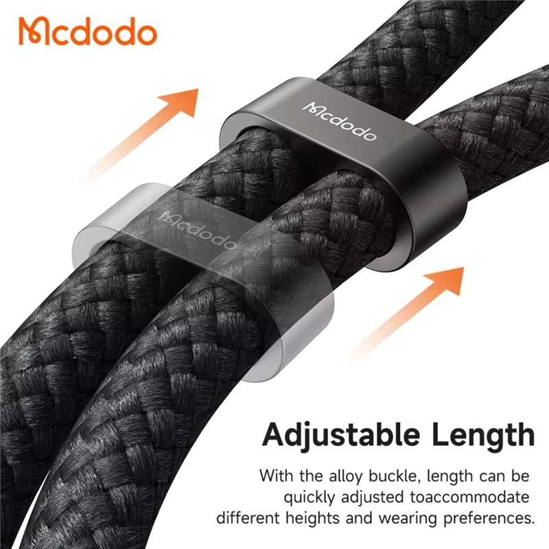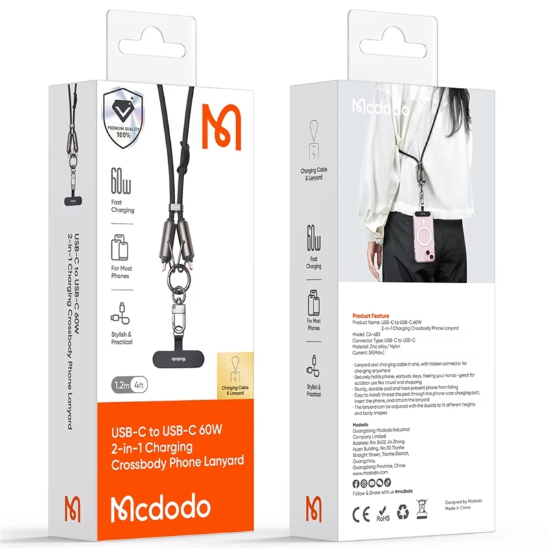 این مدل بند آویز و کابل شارژ، با طراحی مقاوم، قابلیت تنظیم طول و پشتیبانی از شارژ سریع با توان حداکثر 60 وات از طریق پورت  USB-C، در بازار محبوبیت زیادی دارد. از ویژگی های بند آویز موبایل و کابل شارژ 60 وات 1.2 متری USB-c به USB-C مک دودو مدل CA-683 می توان به داشتن گیره های تنظیم بند فلزی محکم اشاره کرد. گیره های فلزی قابل تنظیم این بندآویز و کابل از آلیاژ روی ساخته شده اند که بسیار مقاوم هستند. این مدل کابل شارژ و بندآویز دارای قابلیت تنظیم طول است.